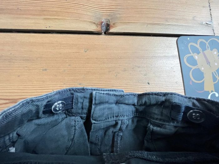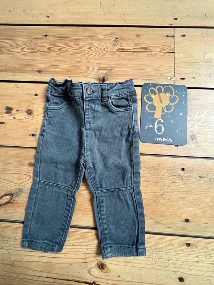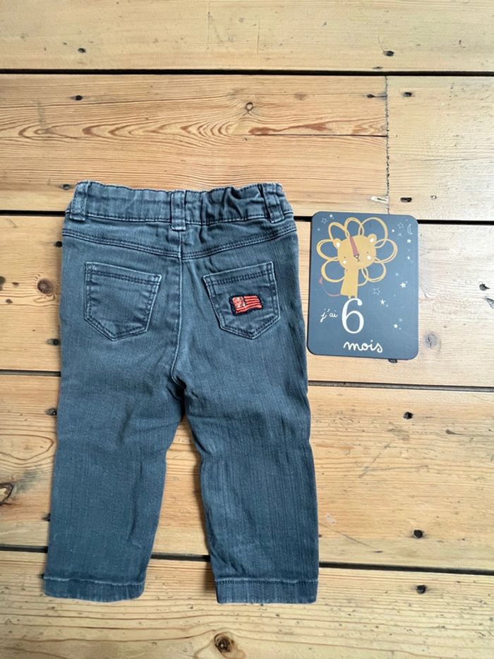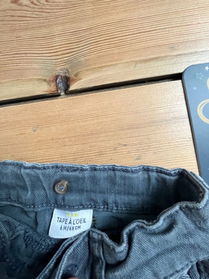 Pantalon jean gris Marque tape a l’œil Porté mais reste en très bon état Pratique car ceinture réglable( voir sur photo) Taille 6 mois 68 cm