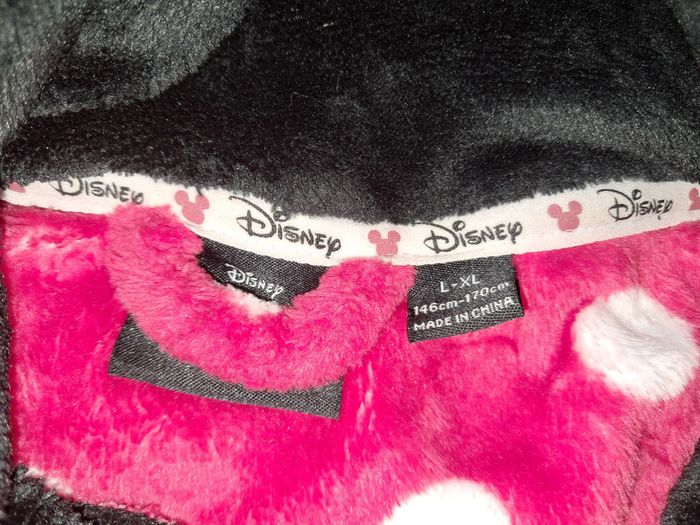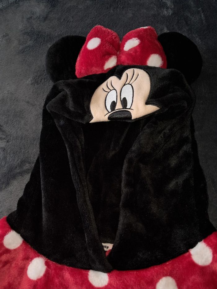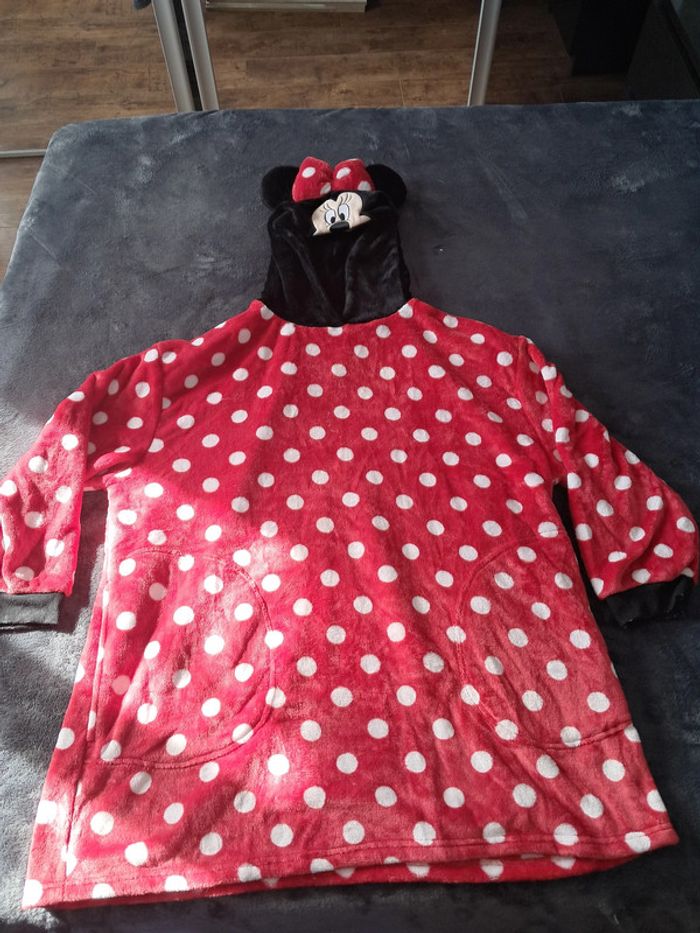 sweat long, peignoir à capuche avec la tete les oreilles et le noeud de Minnie, deux grandes poches bassin, fond rouge pois blanc, en polaire toute douce, taille L-XL (146-170cm), marque Disney, jamais porté