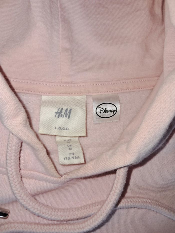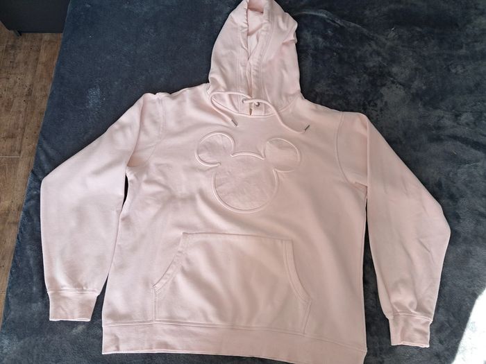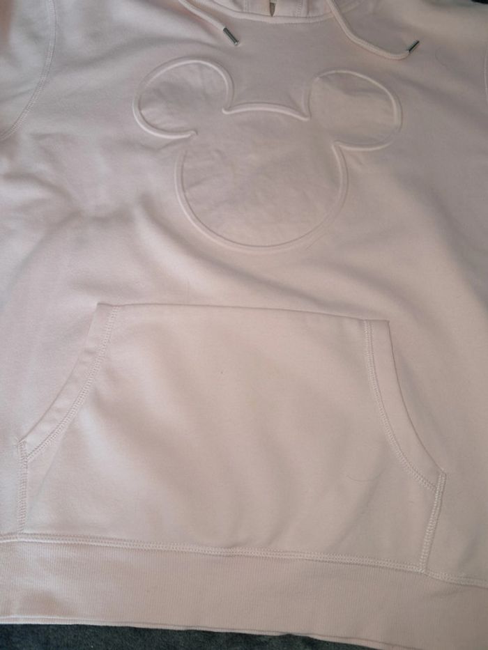 sweat à capuche avec cordon, poche kangourou, tete de Mickey "surpiquée", couleur rose pale, taille M mais grand, marque Disney (H&M), jamais porté