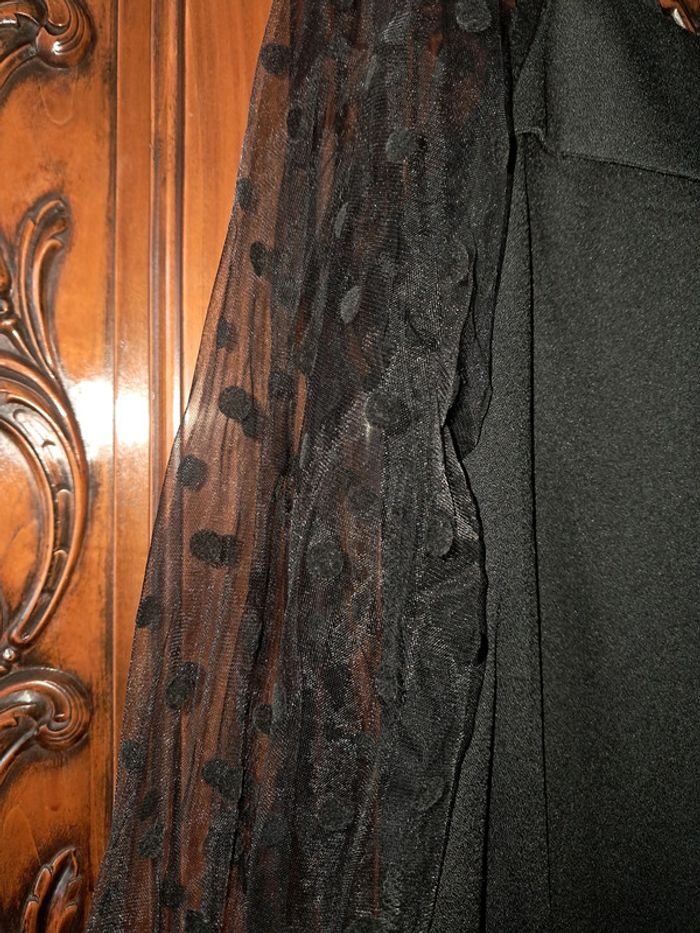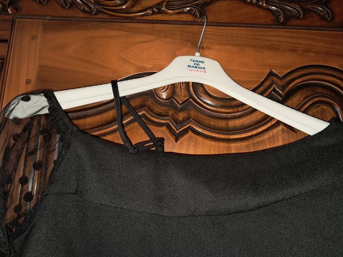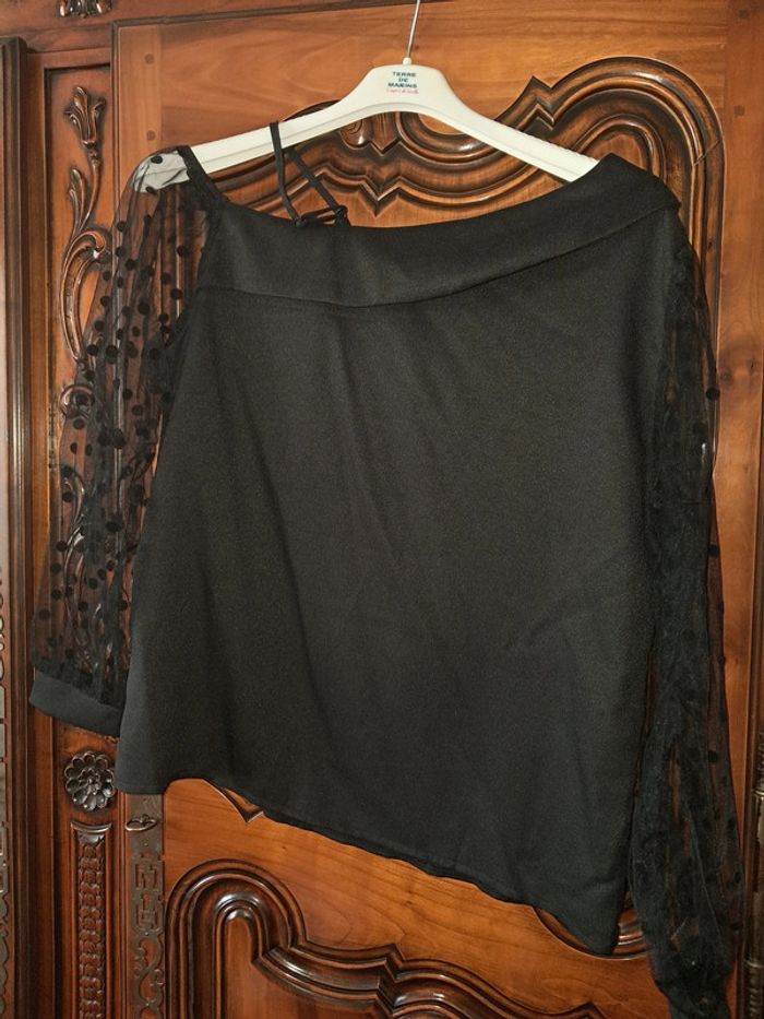 top épaules dénudées, une bretelle réglable, manches en tule avec pois, couleur noir, taille L, marque Shein, jamais porté