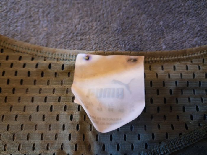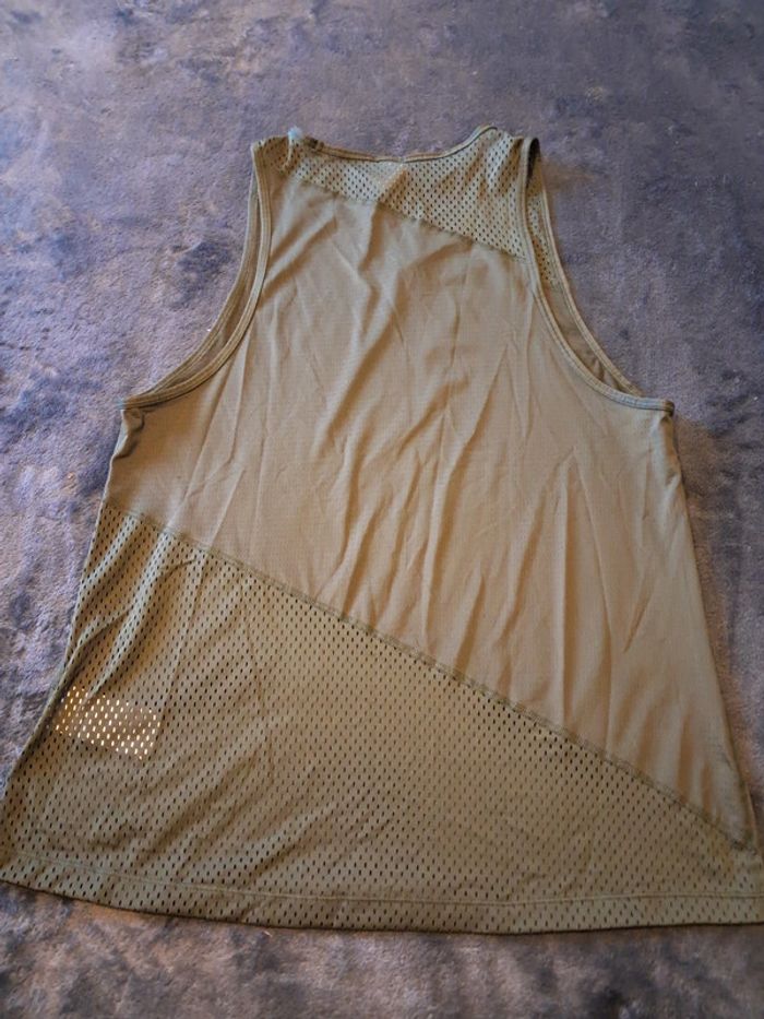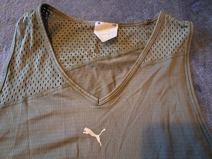 débardeur sport, tout ajouré plus important dans le bas et les épaules, polyester et elastan, couleur kaki, taille 42, marque Puma, jamais porté