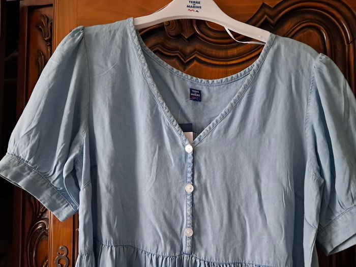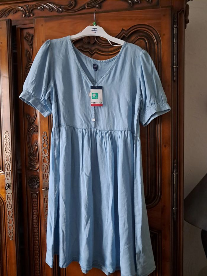 robe fluide en 100 % lyocell, matière naturelle respirante et regulatrice, col V, 3 faux boutons + 1 de rechange, niveau dessous du genou, couleur bleu ciel, taille 40, marque Terre de Marins