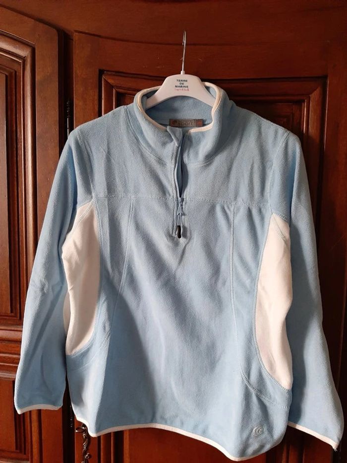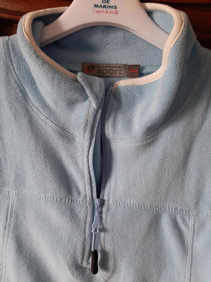 superbe sweat micro polaire, bleu ciel et blanc, col montant avec fermeture éclair, taille 42/44, bas et manche légèrement elastiqués, marque Tout simplement sport, excellent état