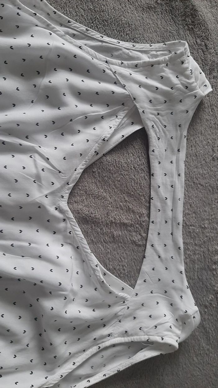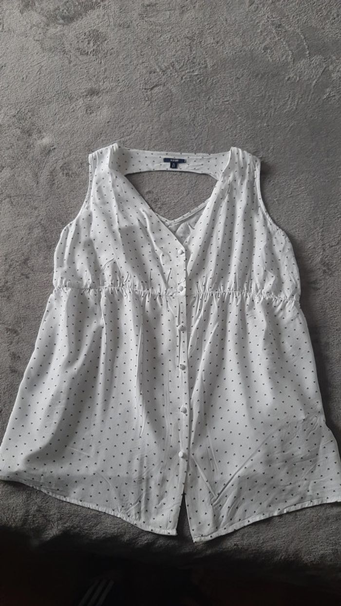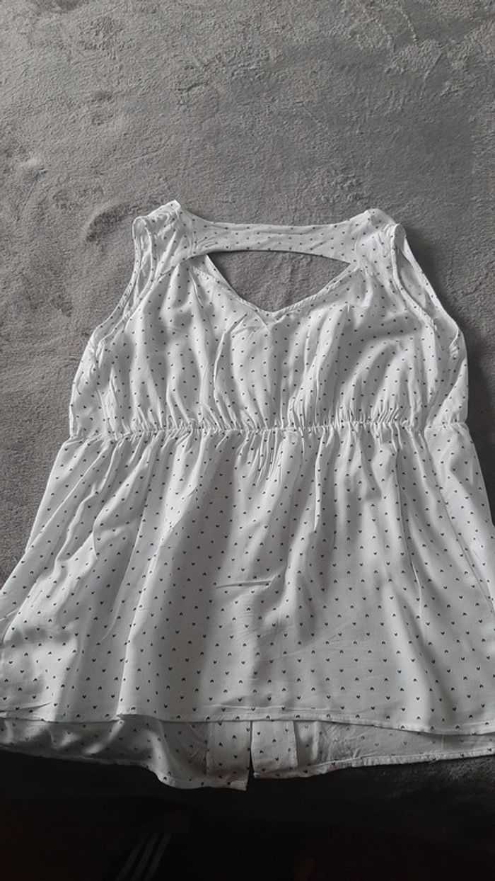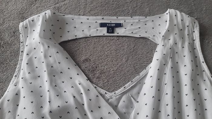 débardeur col V, tout boutonné devant + bouton de rechange, décolleté ouvert dans le dos, un peu plus long devant, couleur blanc cassé avec dessins noir, taille 46, marque Kiabi, jamais porté