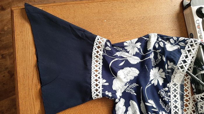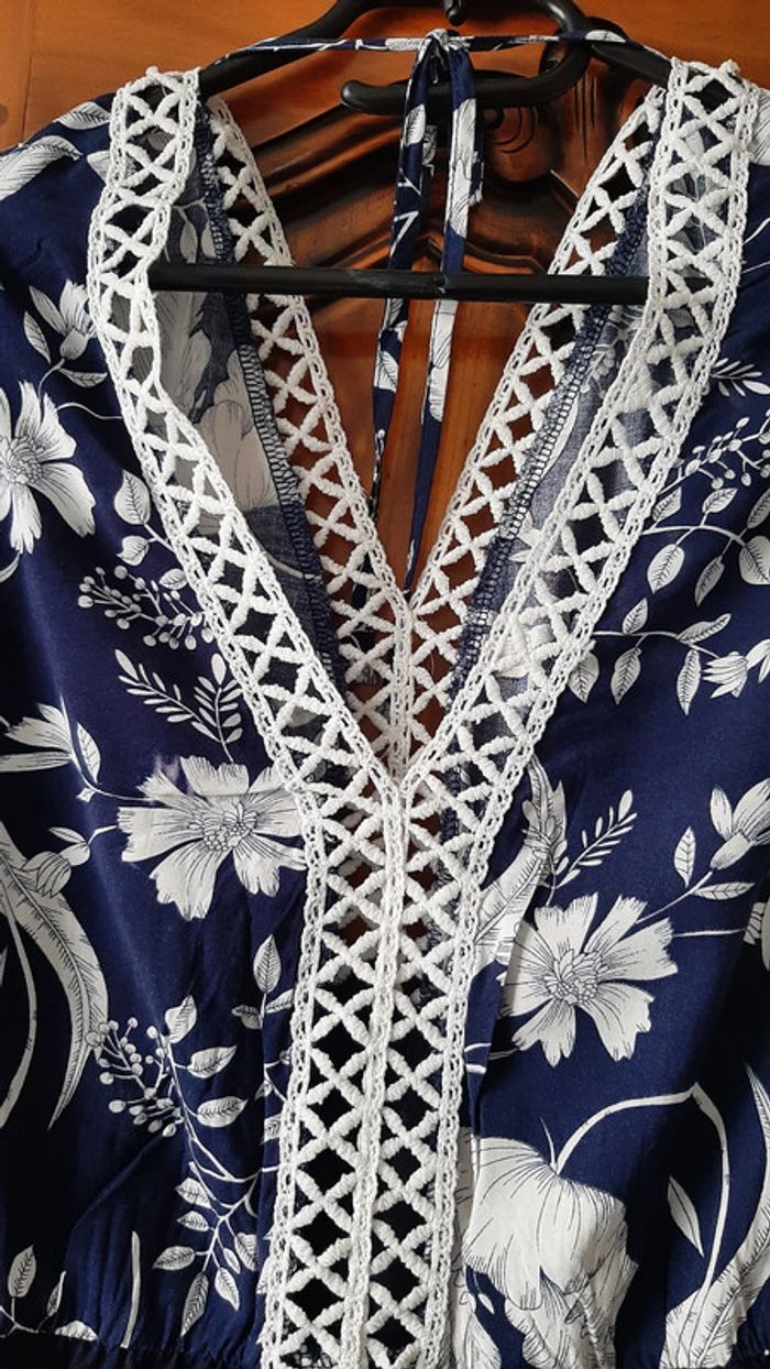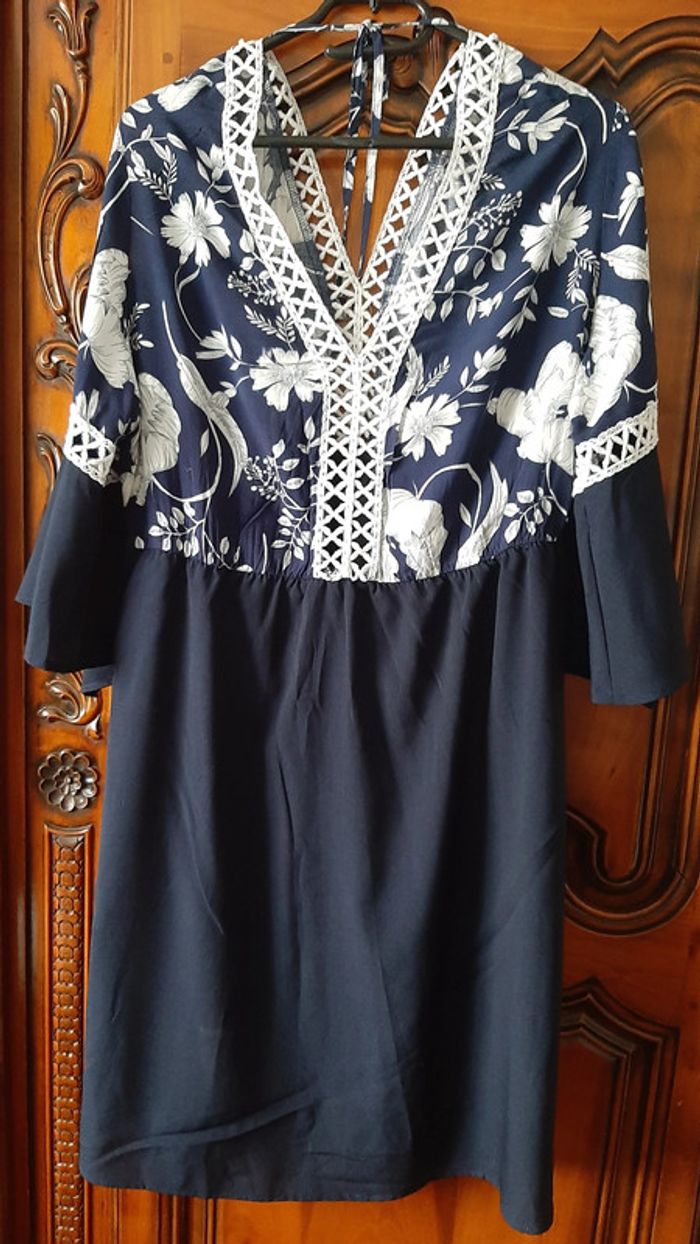 robe manches 3/4, décolleté tout en dentelle en V devant et dans le dos, polyester et coton, niveau genou, pas de taille indiquée mais je dirais 42, jamais portée