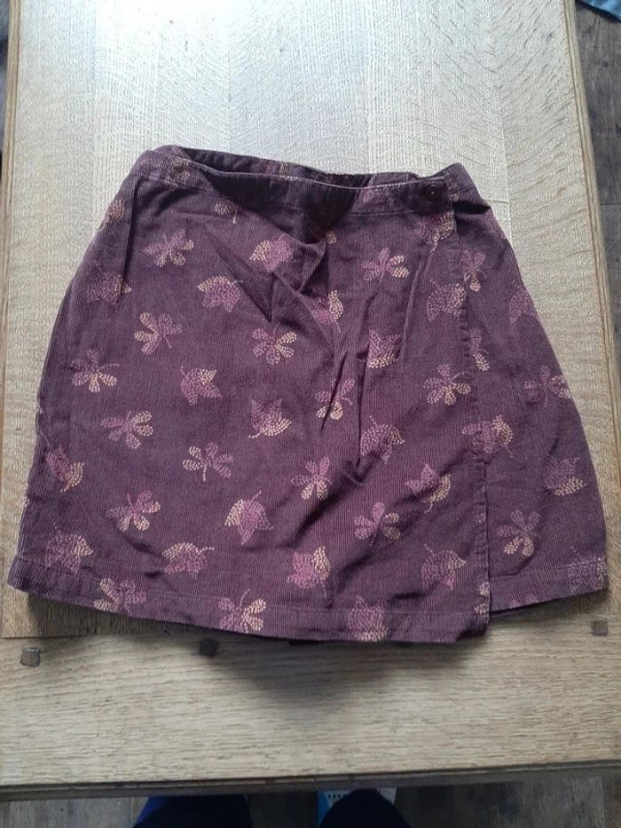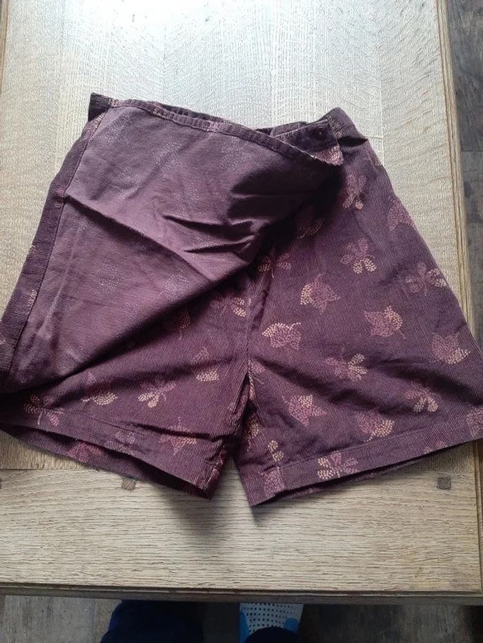 jupe short en velours fin, taille elastiquée, rabat fermé par un bouton, 100% coton, couleur marron glacé, 8 ans, marque CFK
