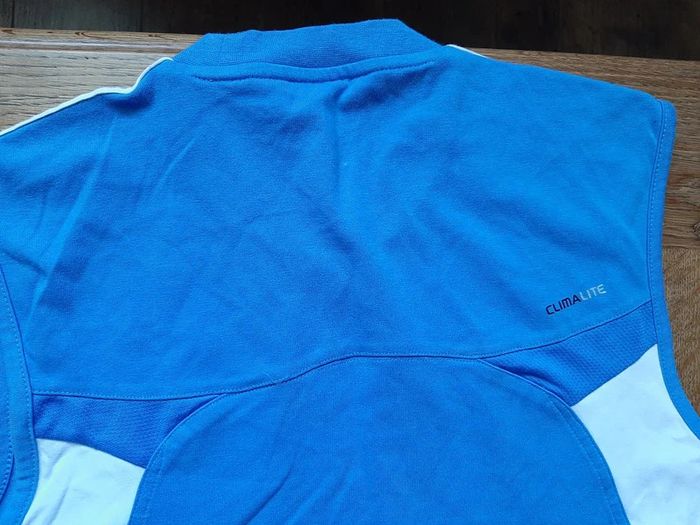 superbe débardeur ADIDAS clima365, taille S, couleur bleu, bandes et cotés blanc, sérigraphie adidas argentée, 70% coton, 30% polyester, jamais porté