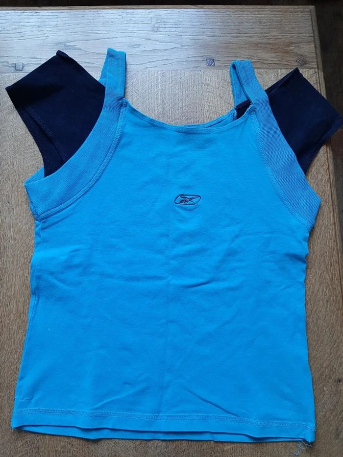 superbe tee shirt REEBOK, taille 42, coton elastane, couleur du débardeur bleu, couleur fausses manches tee-shirt noir