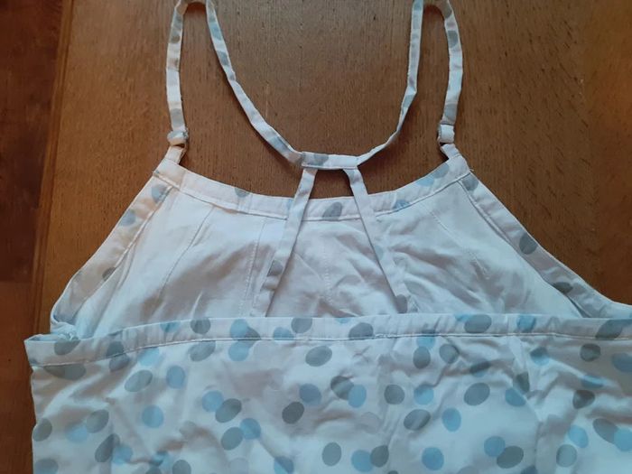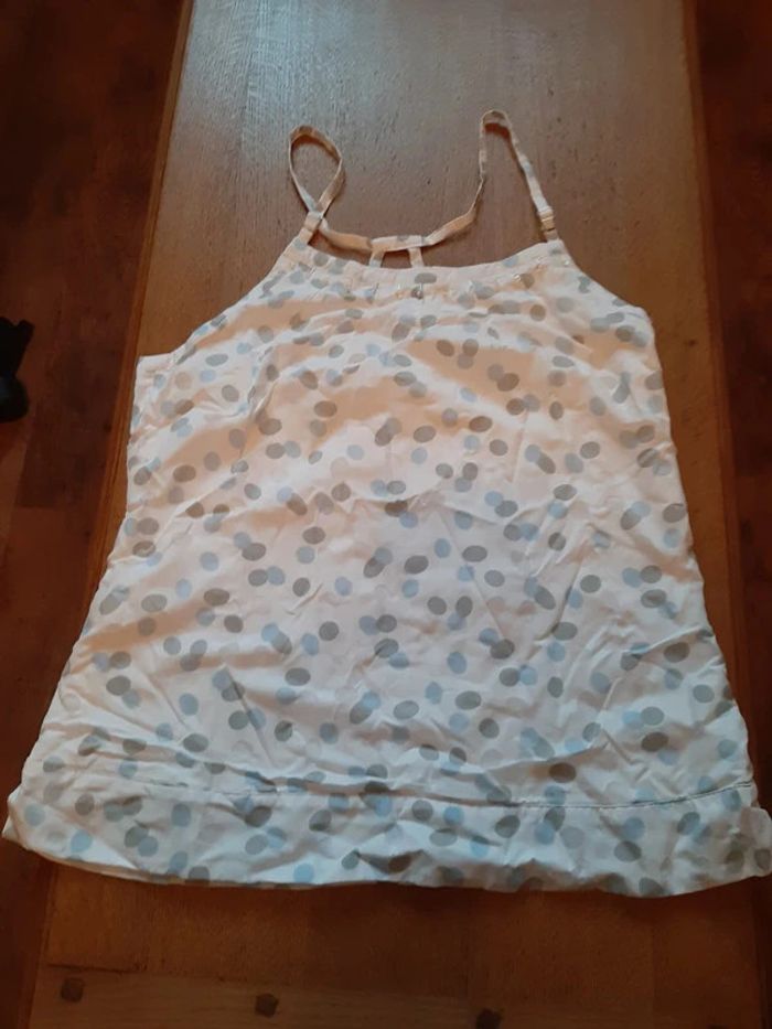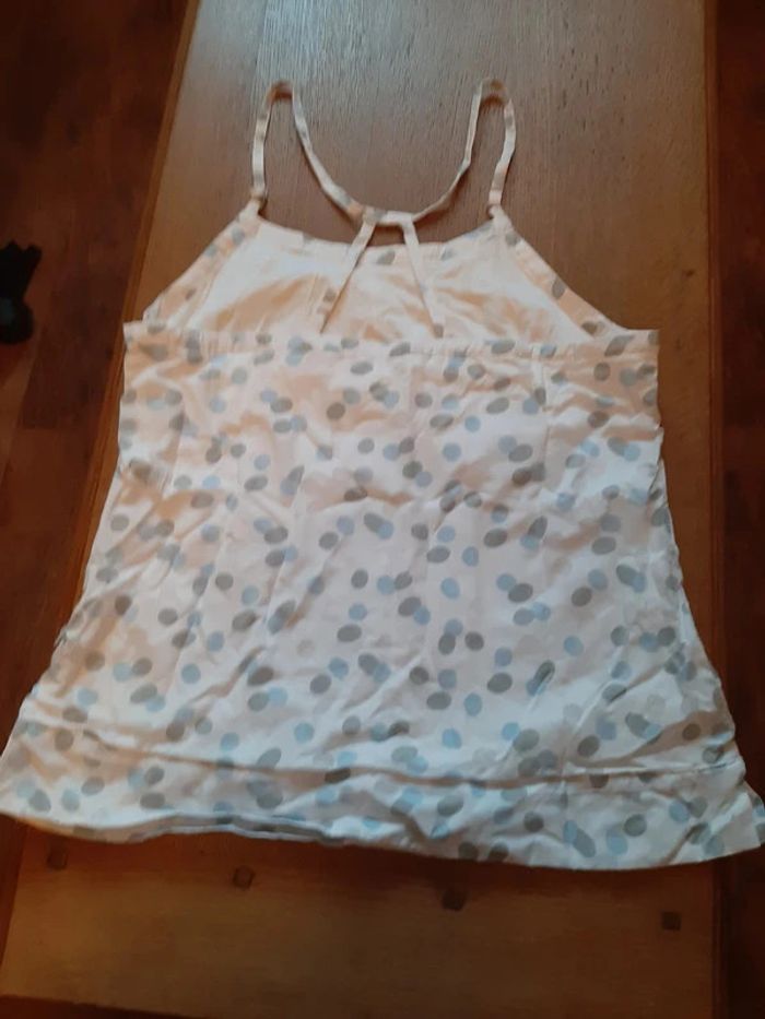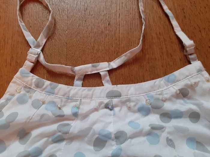 débardeur doublé coton fin, blanc, pois gris et bleu ciel, fines bretelles réglables, fermeture éclair coté gauche, perles + sequins, 60% coton, 40% polyester, taille 44, marque Fil d'Ecume, jamais porté