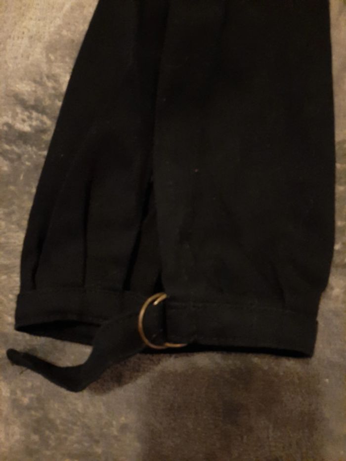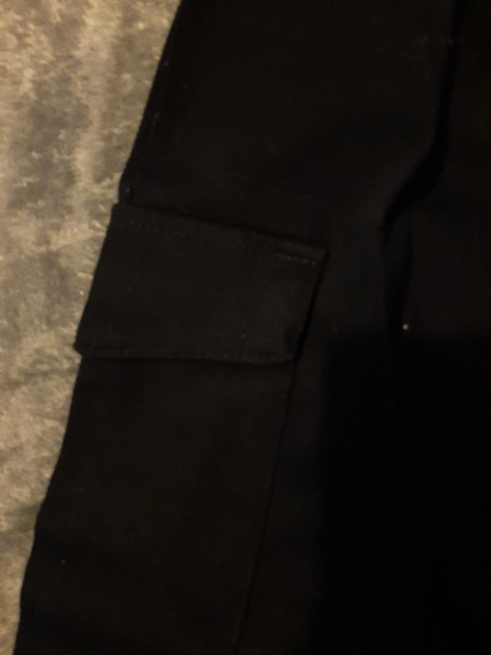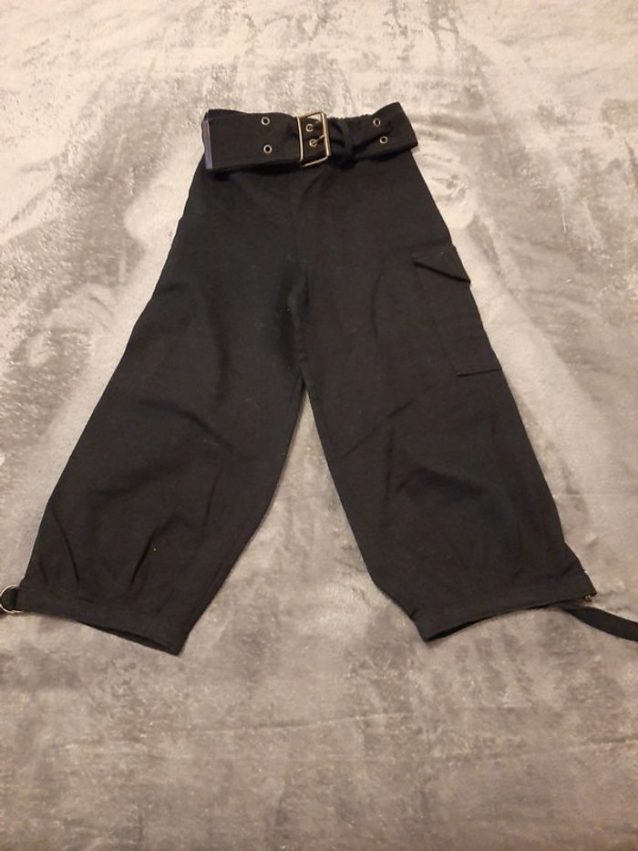 pantacourt coton + élastane, elastique au dos, grosse ceinture, grande poche cuisse gauche, anneaux au bas pour serrer, bleu marine, taille 8 ans