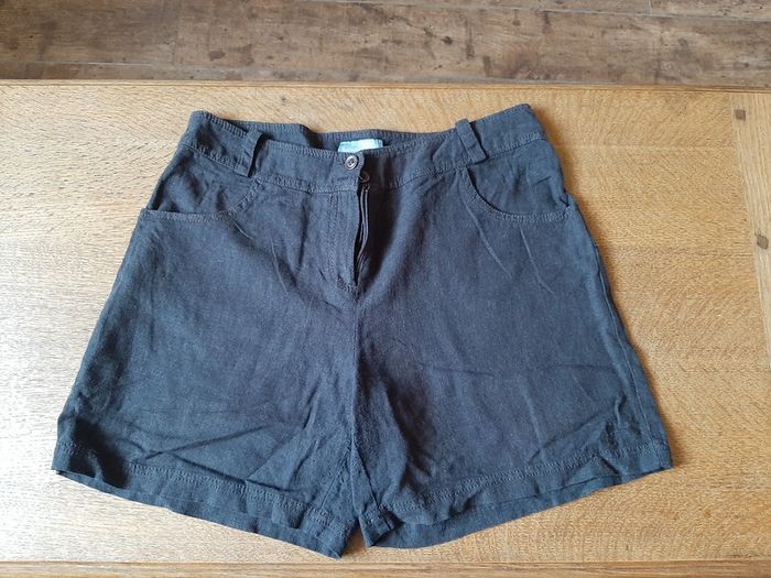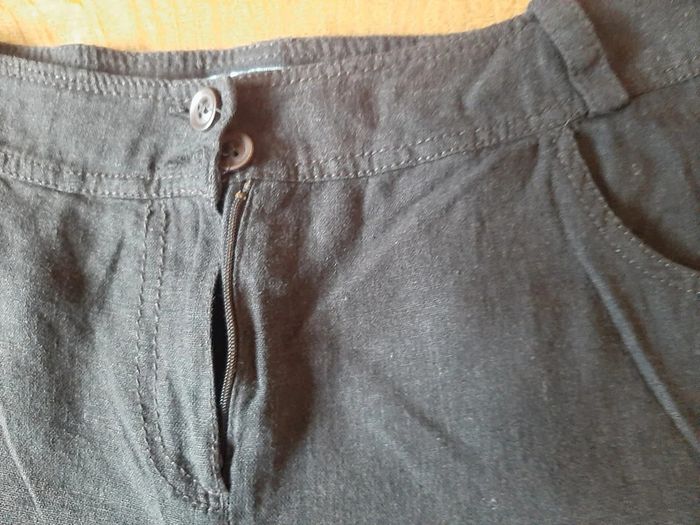 short court en lin marron glacé, fermeture éclair + 2 boutons (1 de rechange), 55% lin, 45% viscose, taille 38, marque Fashion Express