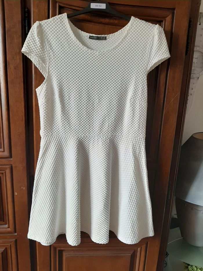 magnifique petite robe blanche, manches courtes, tissu "floké", lègérèrement évasé, indiqué taille 44 mais petit, au dessus du genou, marque Atmosphere, portée 1 fois