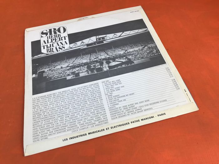 (article vendu en l' état, rayures, crépitements qui n' empêchent pas l' écoute du vinyle, état d' usage voir toutes les photos) Vinyle 33 tours S.R.O Herb Alpert and the Tijuana Brass (1966) SAMX 340496 A1Our Day Will Come Written-By – Hilliard*, Garson* 2:21A2Mexican Road Race Written-By – Sol Lake 2:30A3I Will Wait For You Written-By – Jobim*, Mendonca*, Gimbel* 3:15A4Bean Bag Written-By – Alpert*, Pisano*, Wechter* 1:58A5The Wall Street Rag Written-By – Ervan Coleman 2:25A6The Work Song Written-By – N. Adderley*, O. Brown, Jr.* 2:10B1Mame Written-By – Jerry Herman 2:08B2Blue Sunday Written-By – Julius Wechter 2:49B3Don't Go Breaking My Heart Written-By – B. Bacharach-H. David* 2:38B4For Carlos Written-By – Alpert*, Pisano*, Ceroli* 2:46B5Freight Train Joe Written-By – John Pisano 2:37B6Flamingo Written-By – Anderson*, Grouya* 2:25