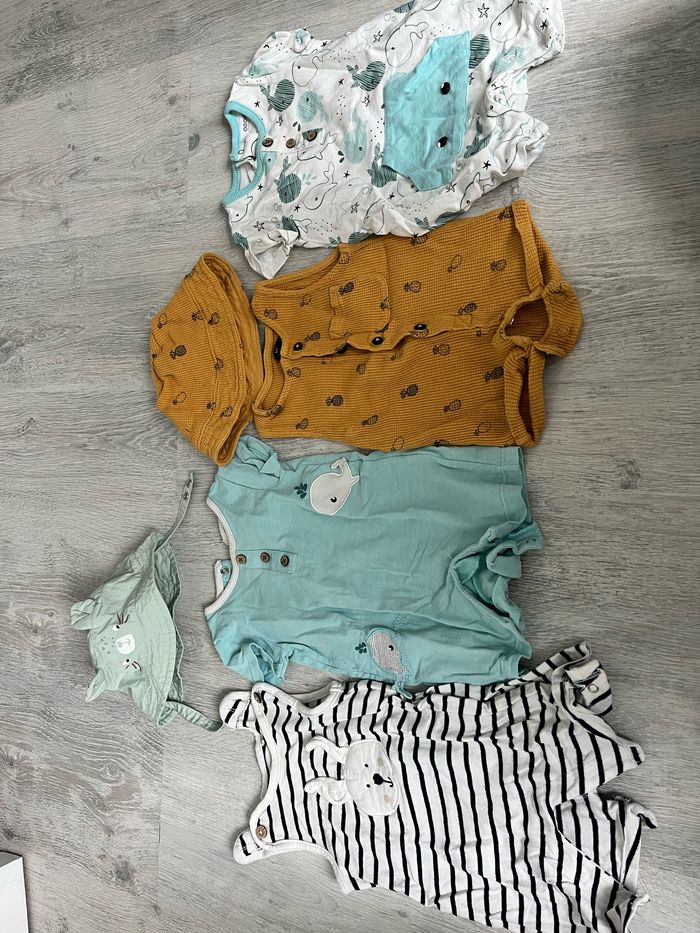 Lot 3 mois été 36 pièces. Très bon état. Marque : kiabi, gémo, orchestra 4 pyjama fin 6 short 1 salopette short 10 tee shirt 2 chemises 1 pantalon 1 salopette légère 4 combi short 2 chapeaux 3 body 1 haut manche longue léger 1 ensemble