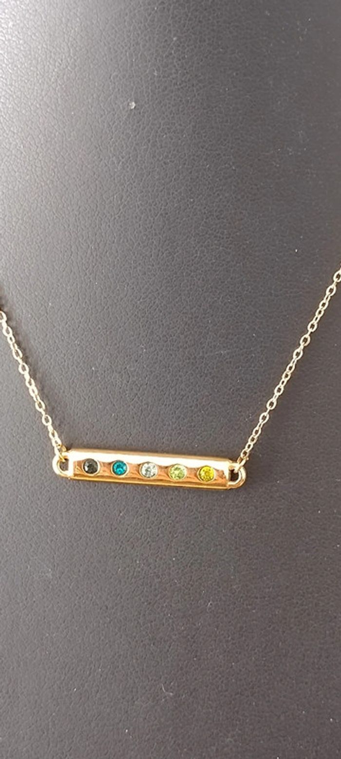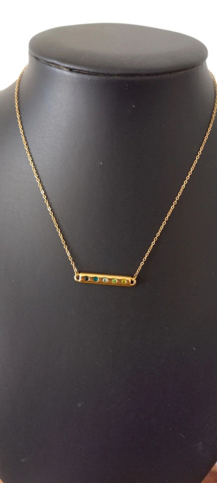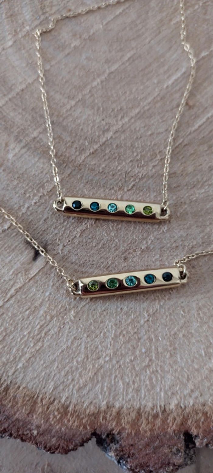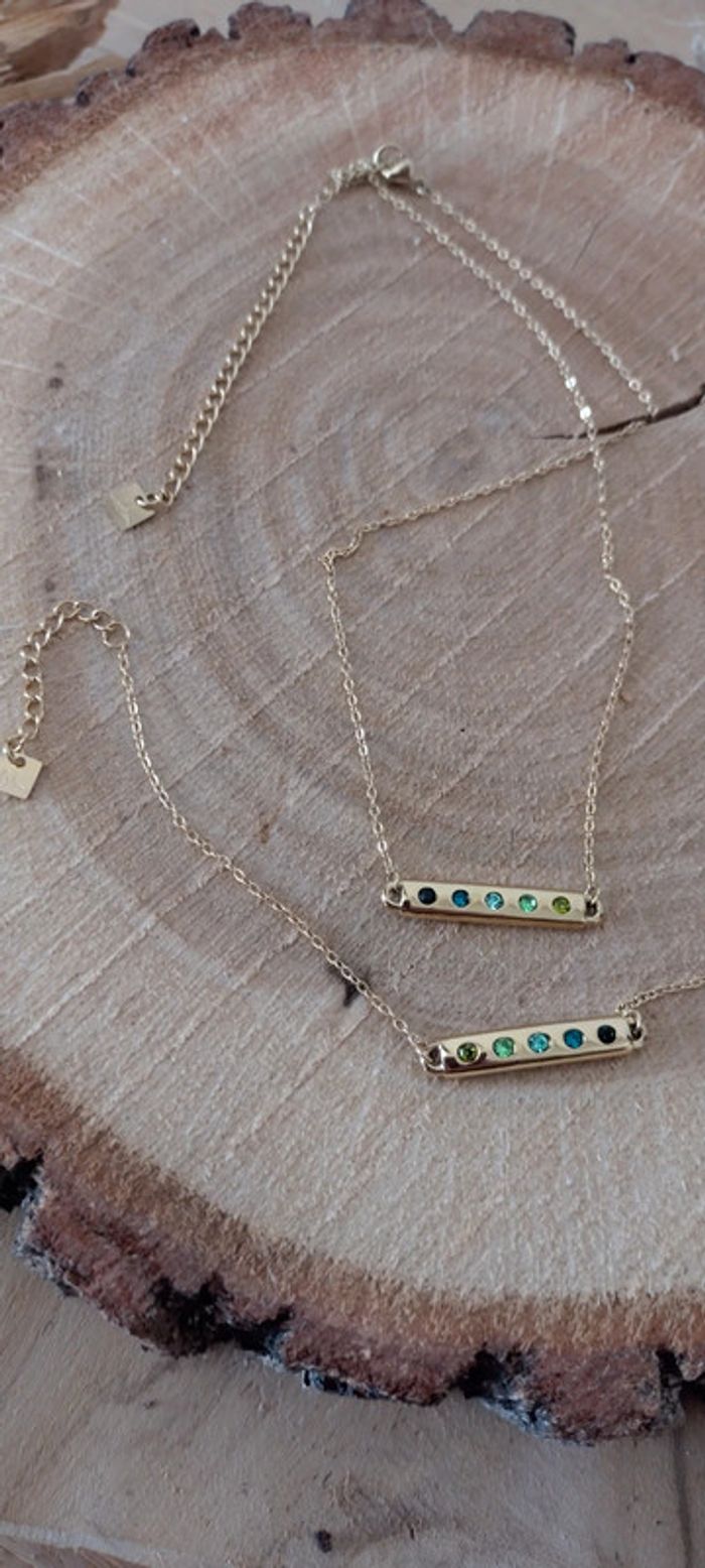 Collier et bracelet strass dégradé de vert, acier inoxydable doré, marque Bohm ,magnifique parure pour les décolletés de l'été, Long collier 37+7cm de rallonge, long bracelet 16+3cm, collier peut se vendre seul à 10 euros