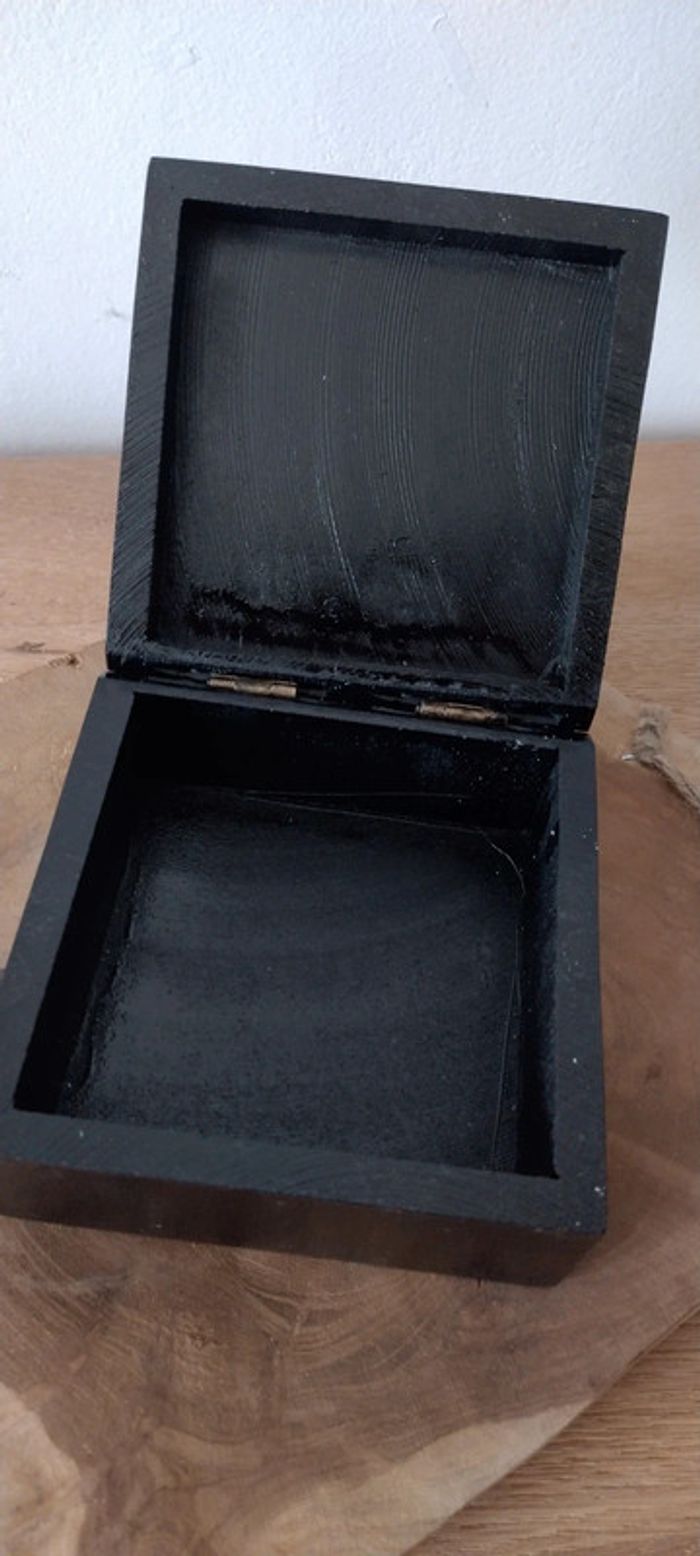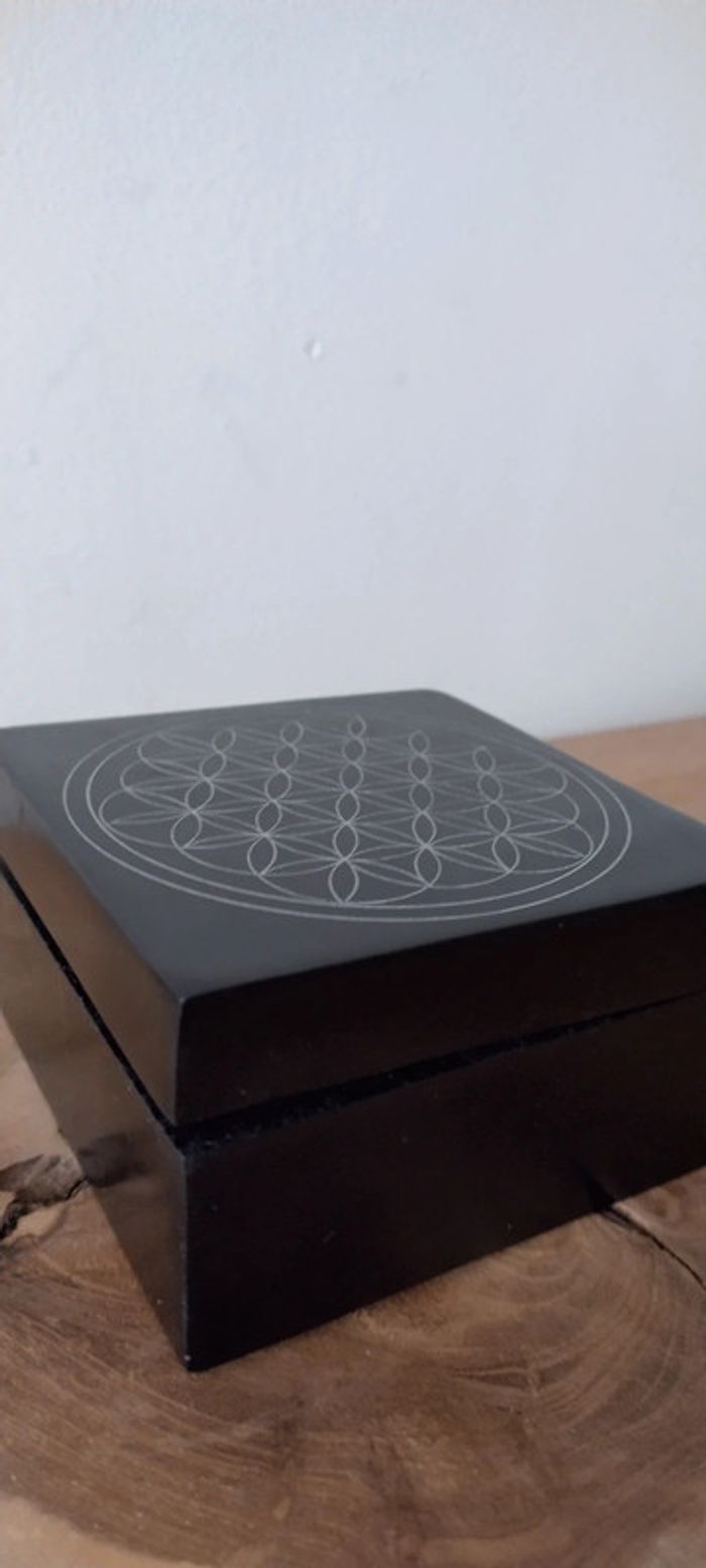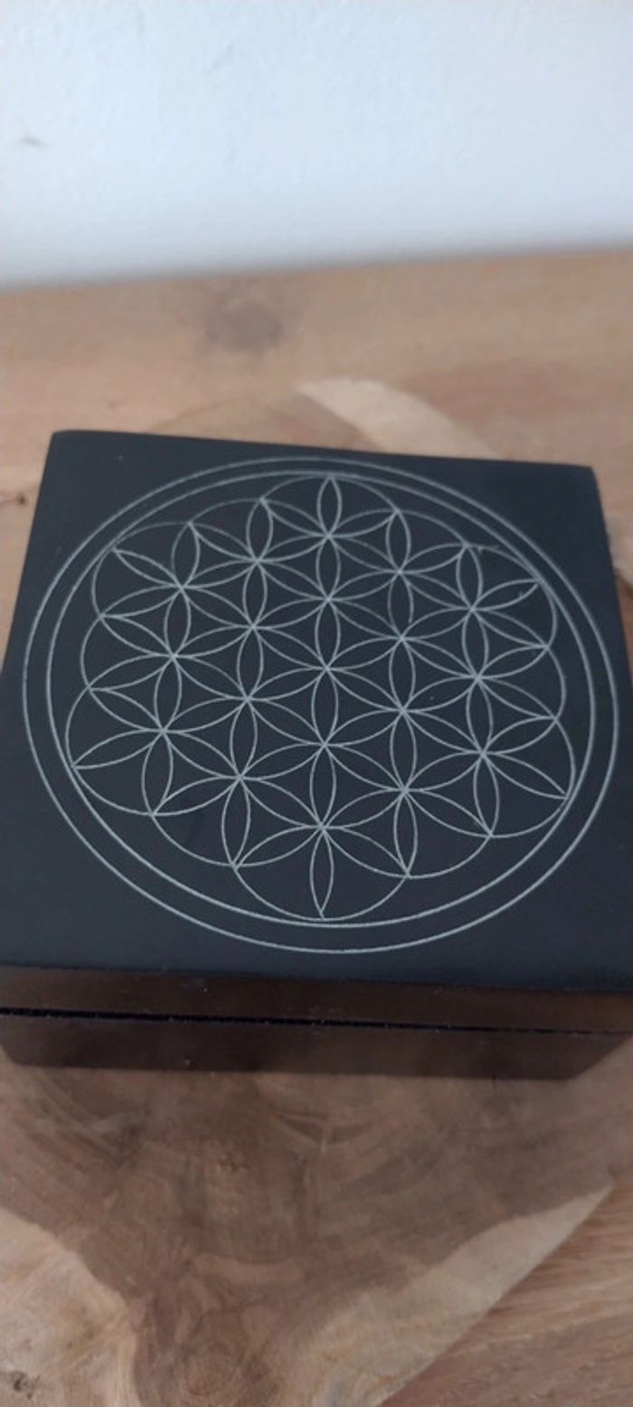 Boite en pierre de savon, avec gravure fleur de vie, idéale pour recharger les pierres ou les bracelets pierres naturelles , couleur noire, dimensions 10x10x5,5cm, fabrication artisanale, acheté en Inde.