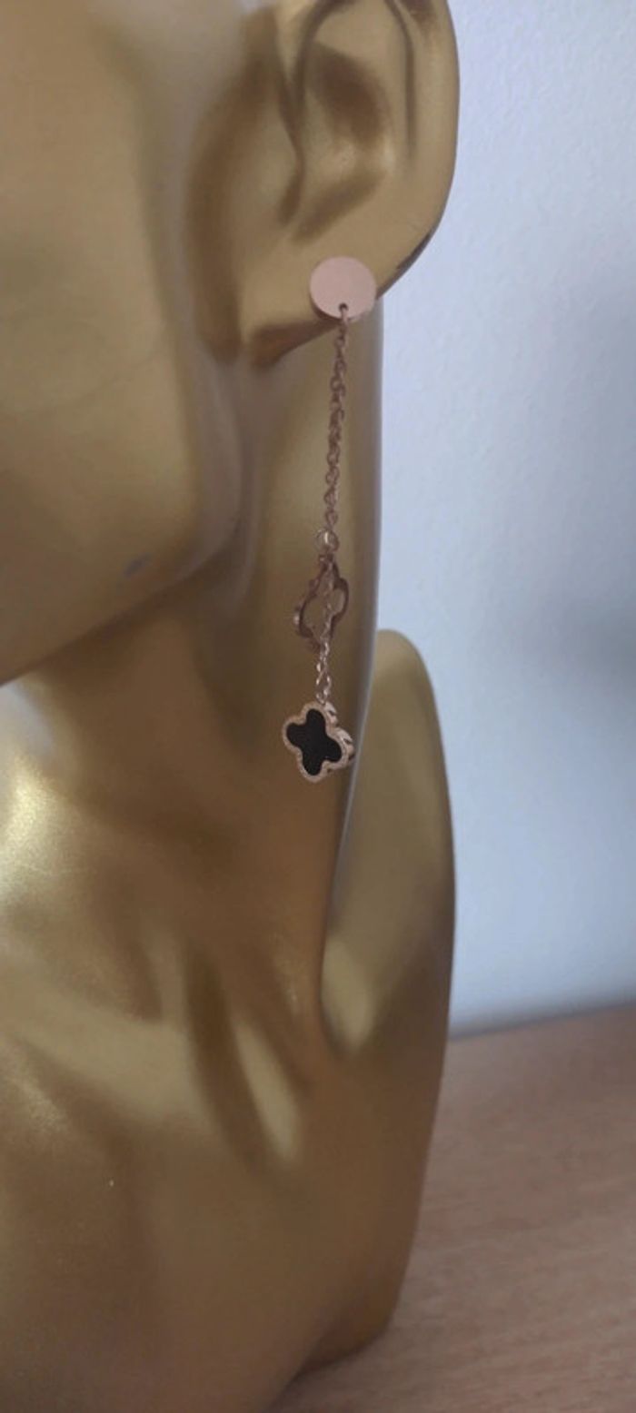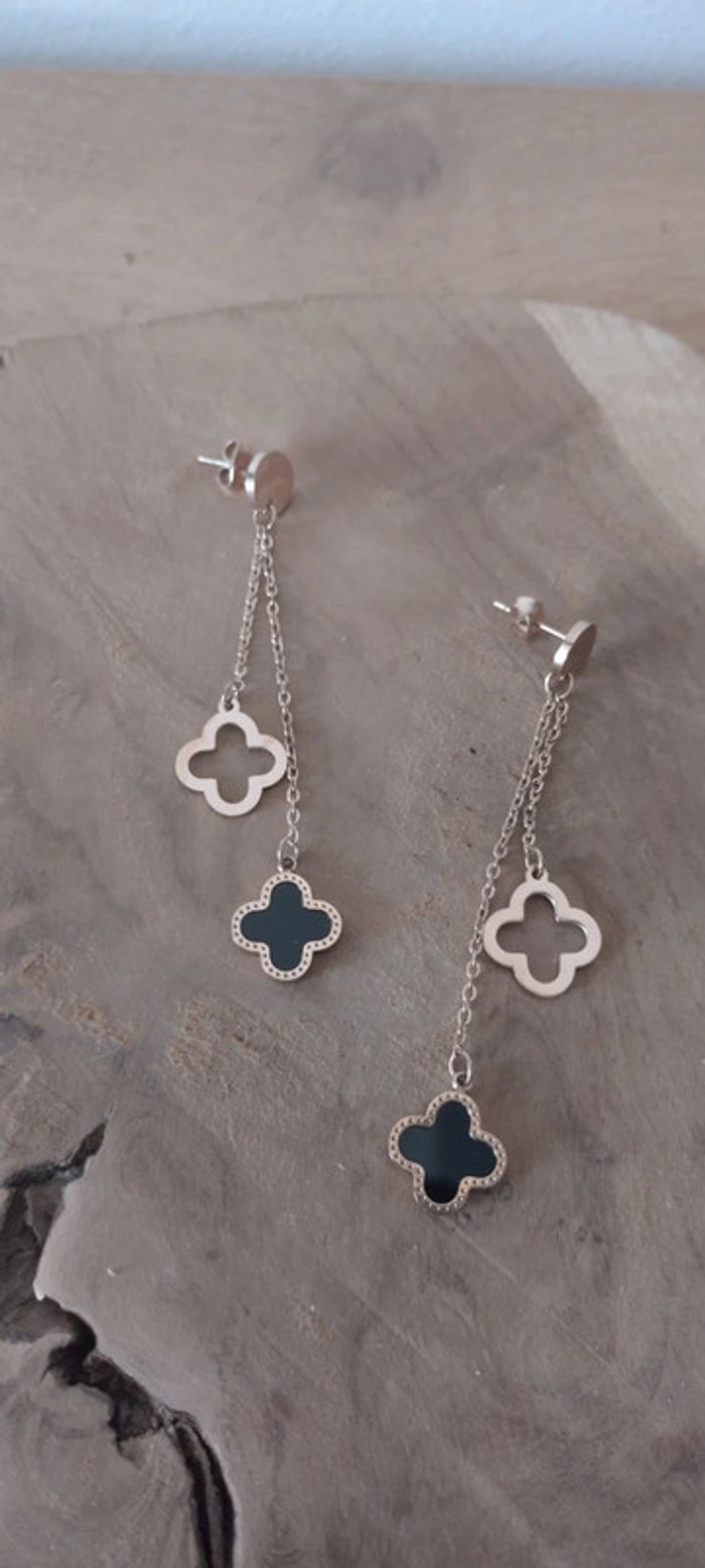 Boucles d'oreilles pendantes trèfles noir et trèfle ajouré, acier inoxydable, longueur 7,5cm