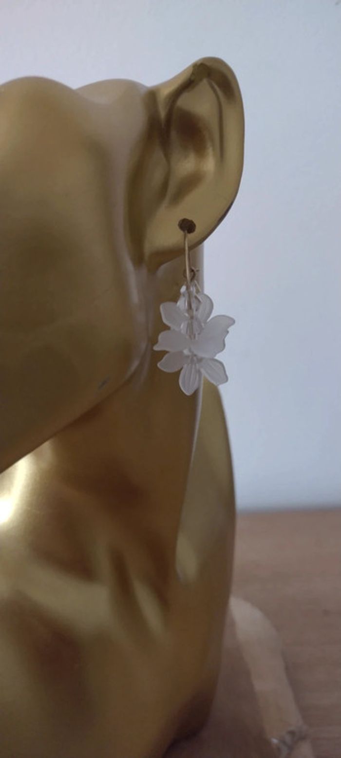 Créoles fleurs et perles, fleurs façon verre poli, acrylique, très légères, diamètre créoles 3cm, longueur totale 4cm