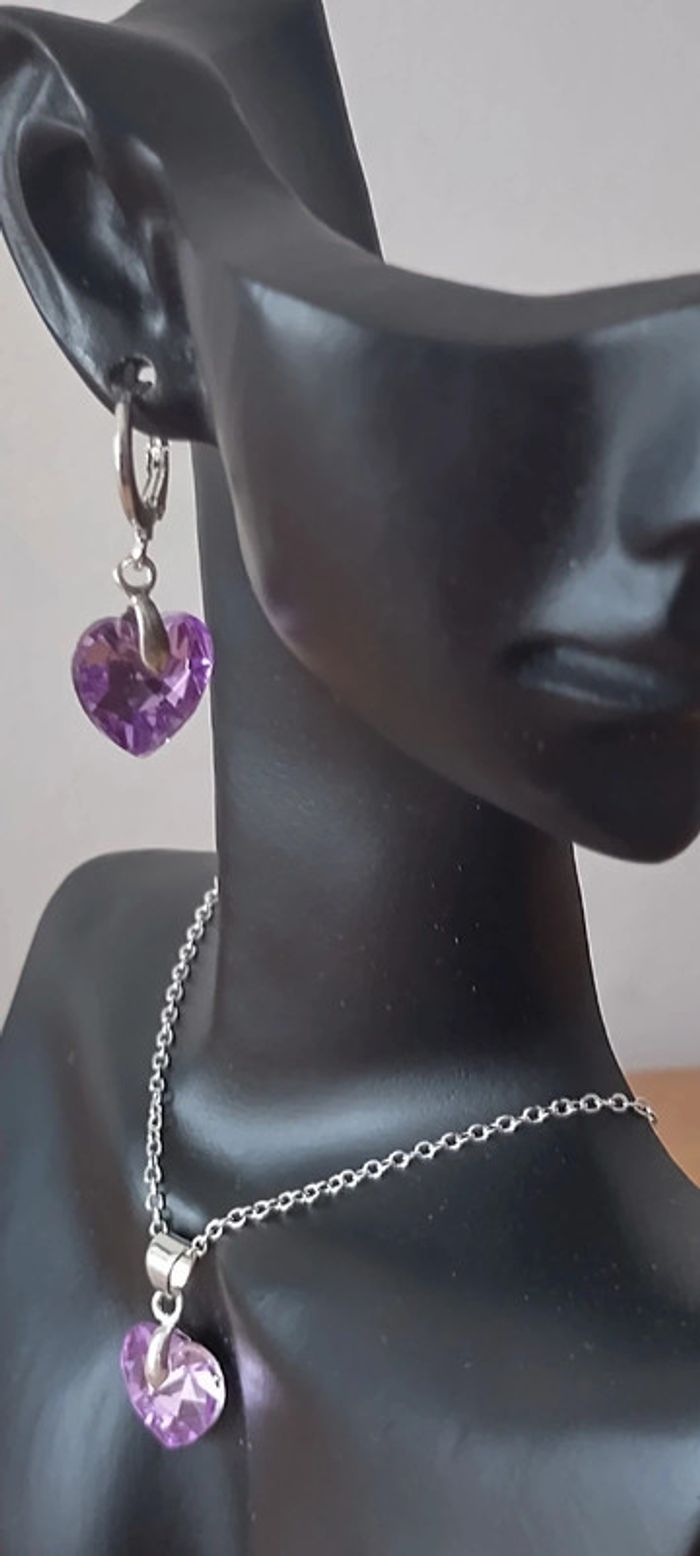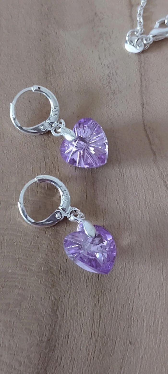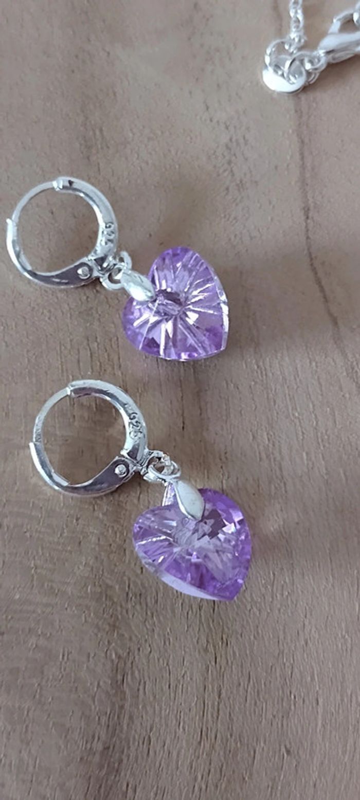 Boucles d'oreilles et collier argent 925, coeur rose, chaîne 45 cm, non noircie, parure jamais portée