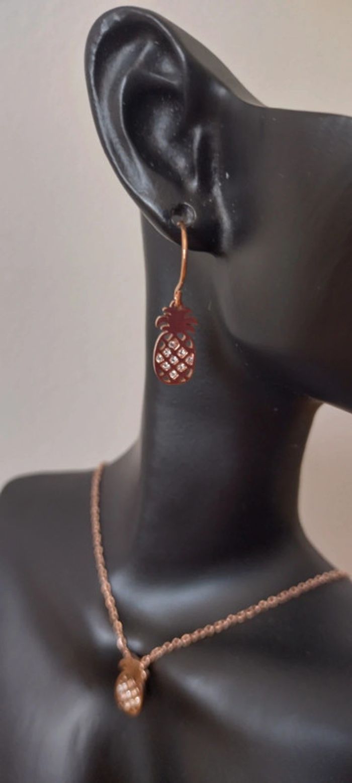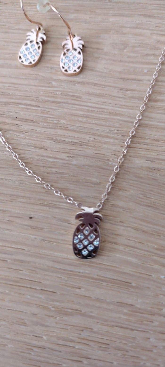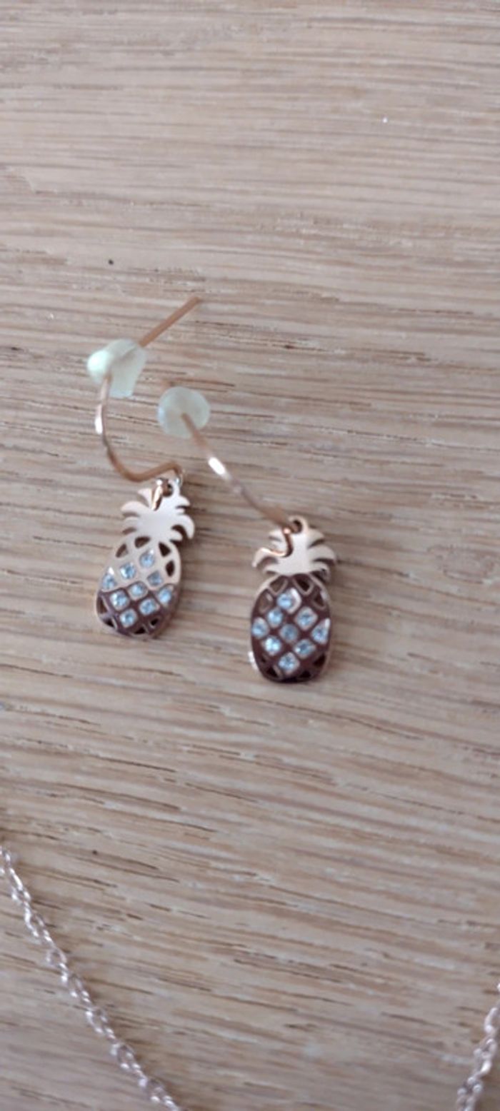 Parure boucles d'oreilles et collier Ikita ananas, acier inoxydable rose gold et oxyde de zirconium, collier 40+5cm, état neuf, jamais porté