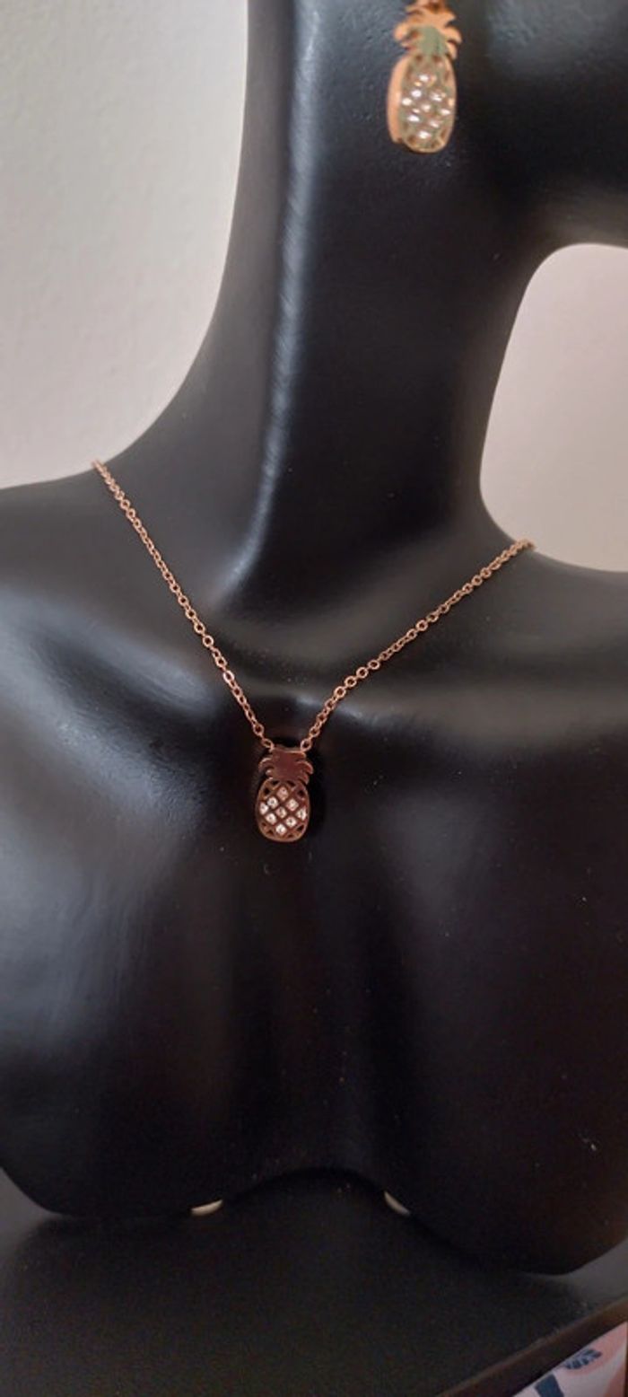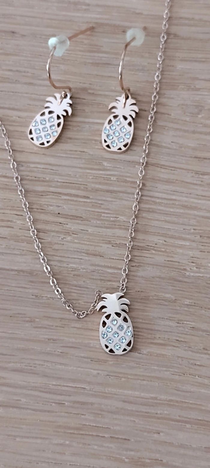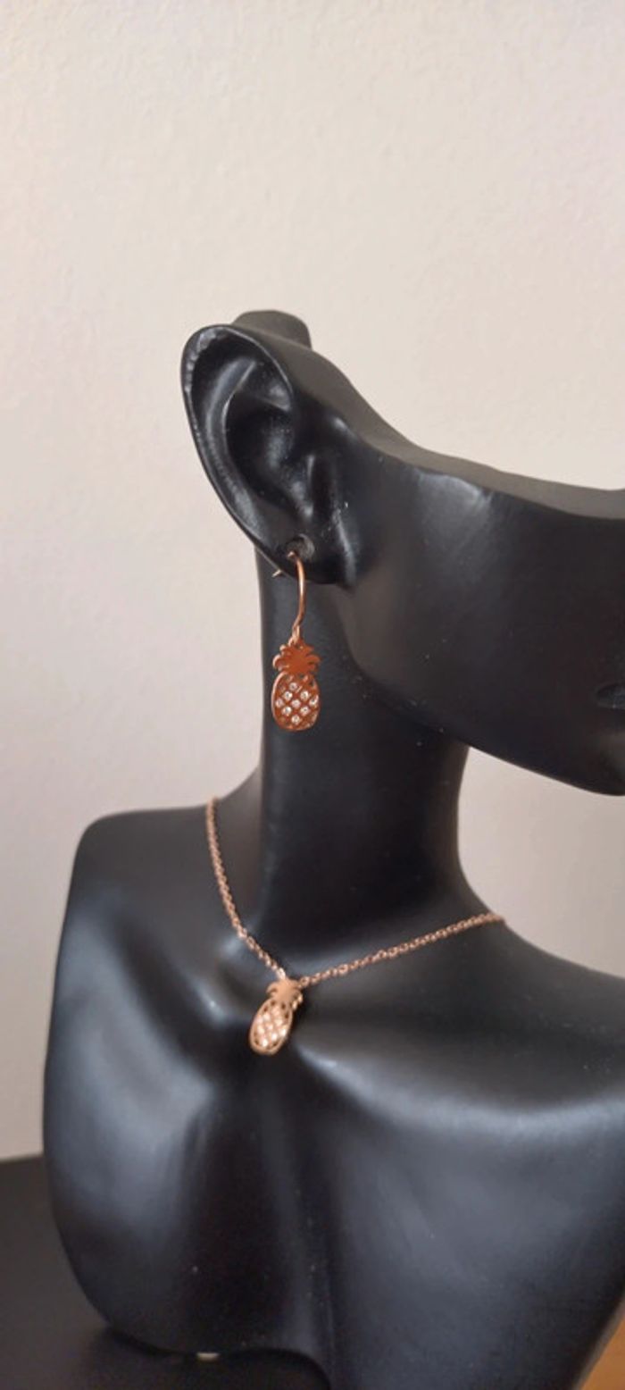 Parure boucles d'oreilles et collier Ikita ananas, acier inoxydable rose gold et oxyde de zirconium, collier 40+5cm, état neuf, jamais porté