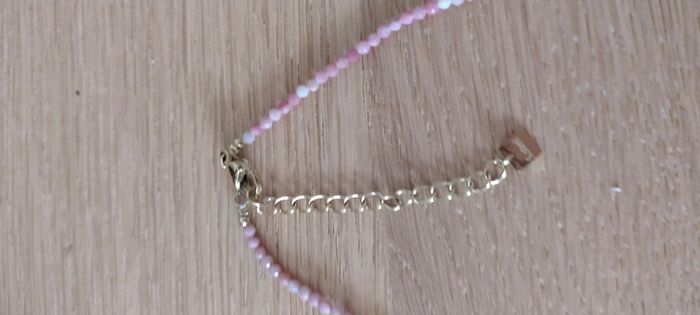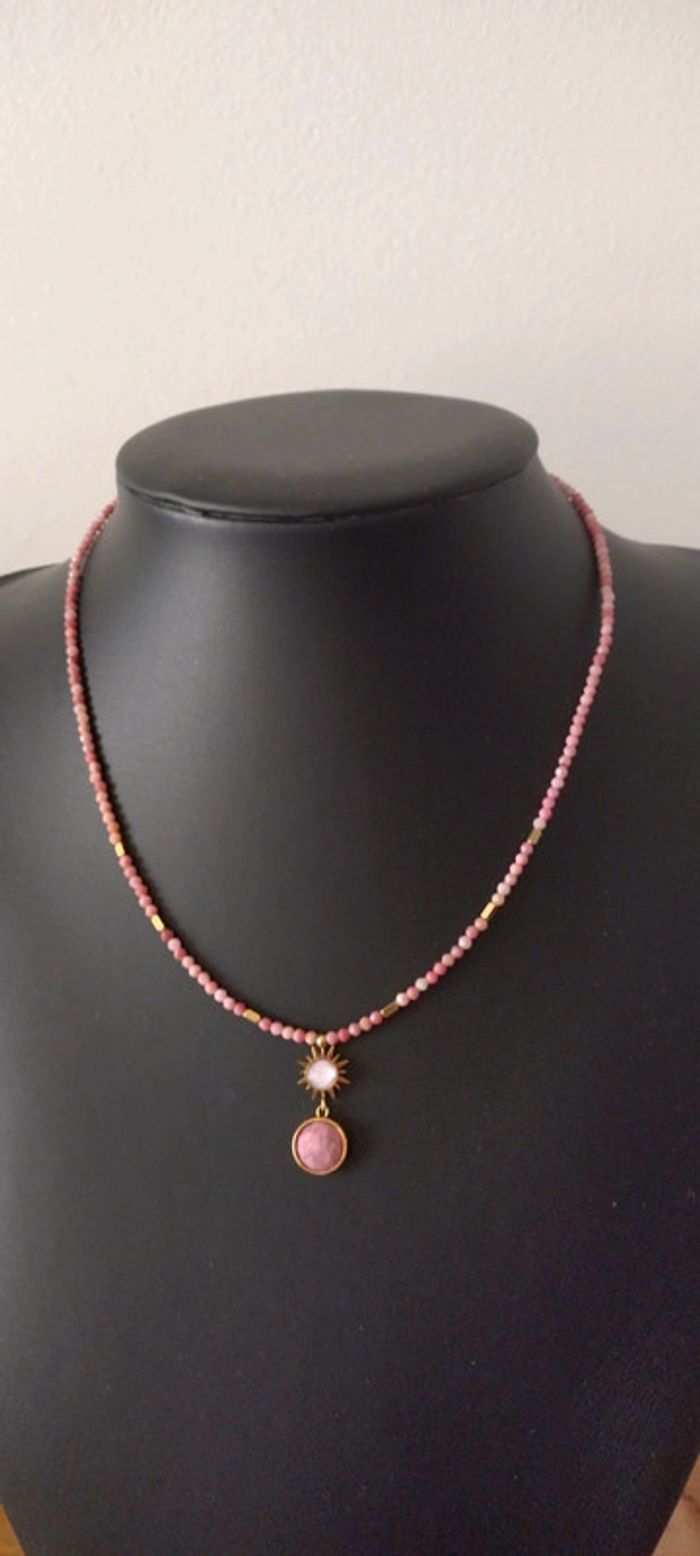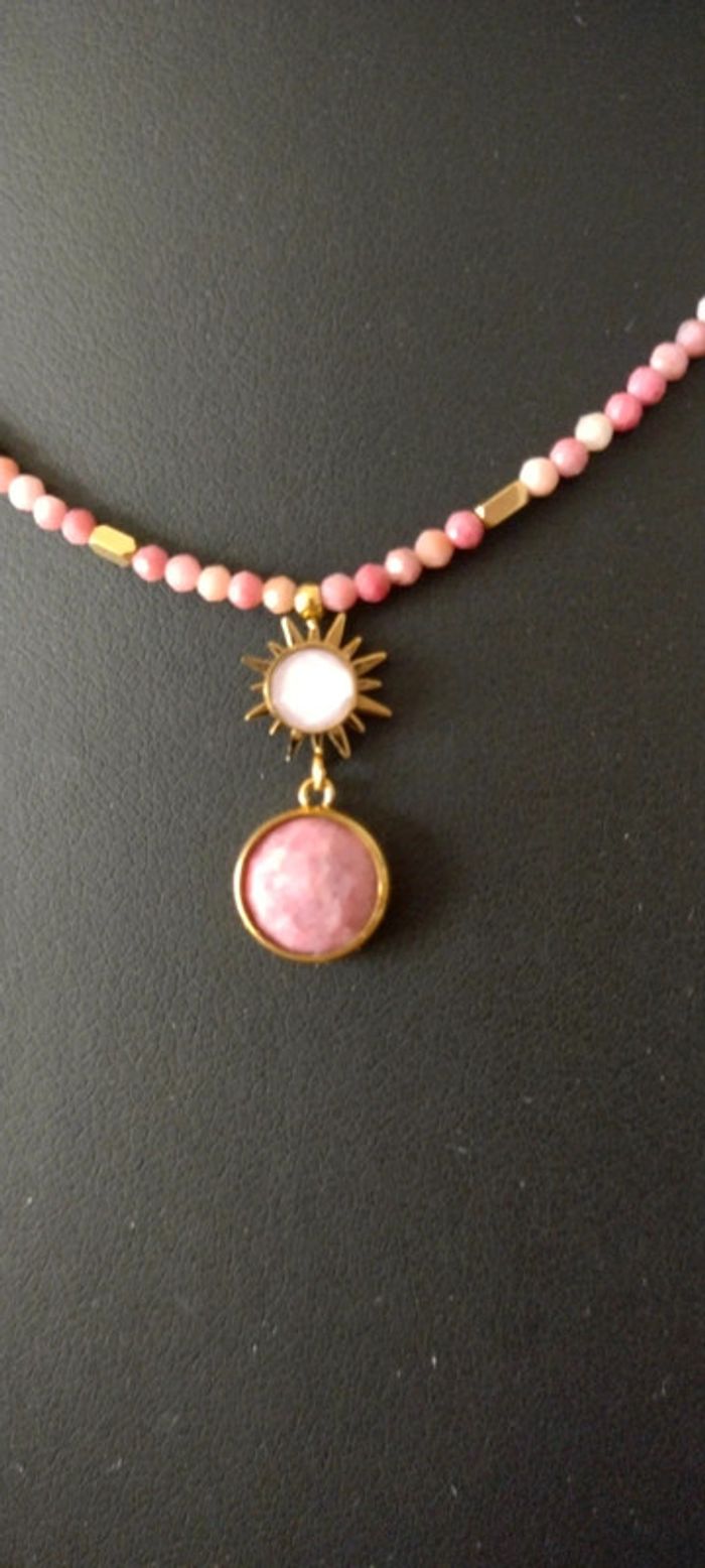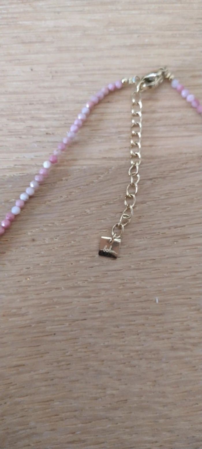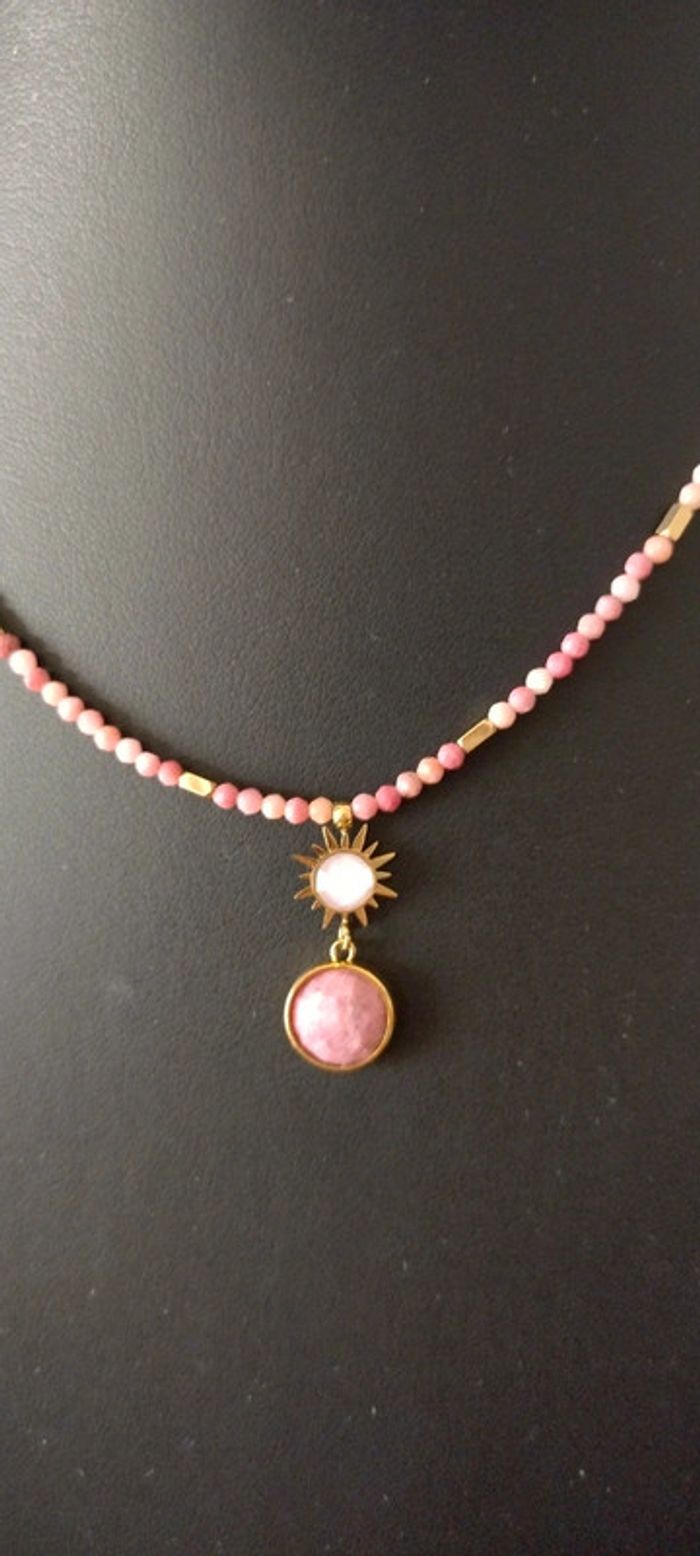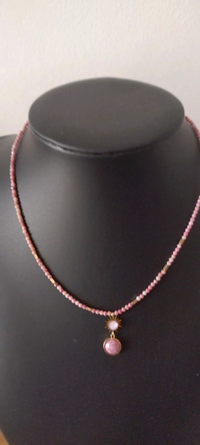 Collier Bohm pierres naturelles rhodonite et cristal Swarovski, acier inoxydable, doré, 38+5cm, jamais porté