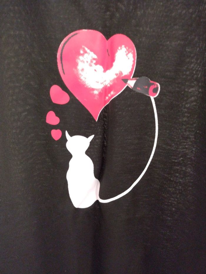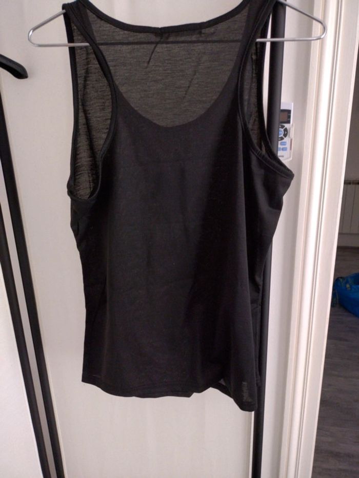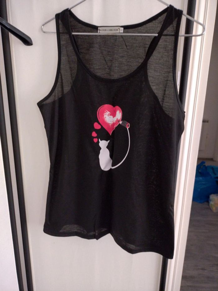 Tee shirt débardeur noir avec motif chat, taille xl, jamais porté taille petit, plutôt L, coton et polyester