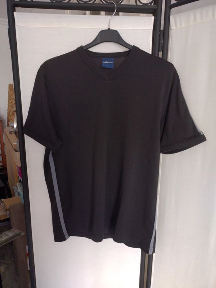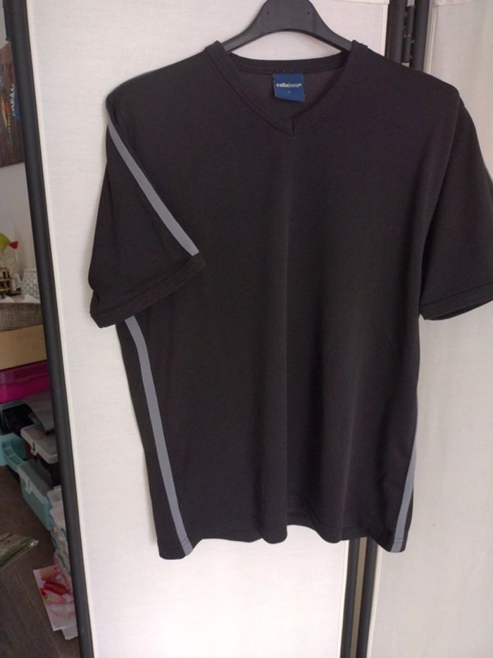 Tee shirt col V Celio, taille L, polyester, avec liseré gris vertical, excellent état