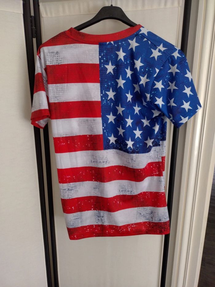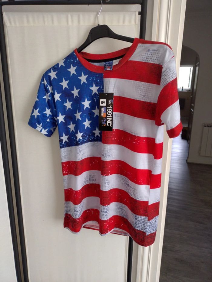 Tee shirt homme, polyester et élasthane, neuf, taille petit, noté L, correspond plutôt à un M
