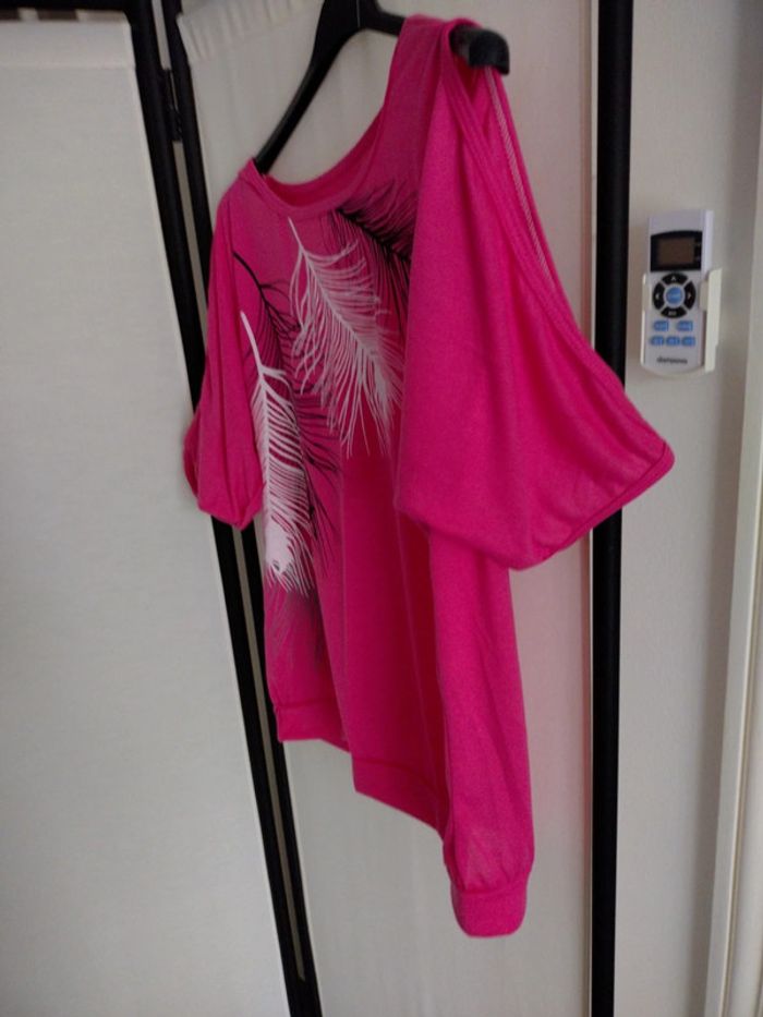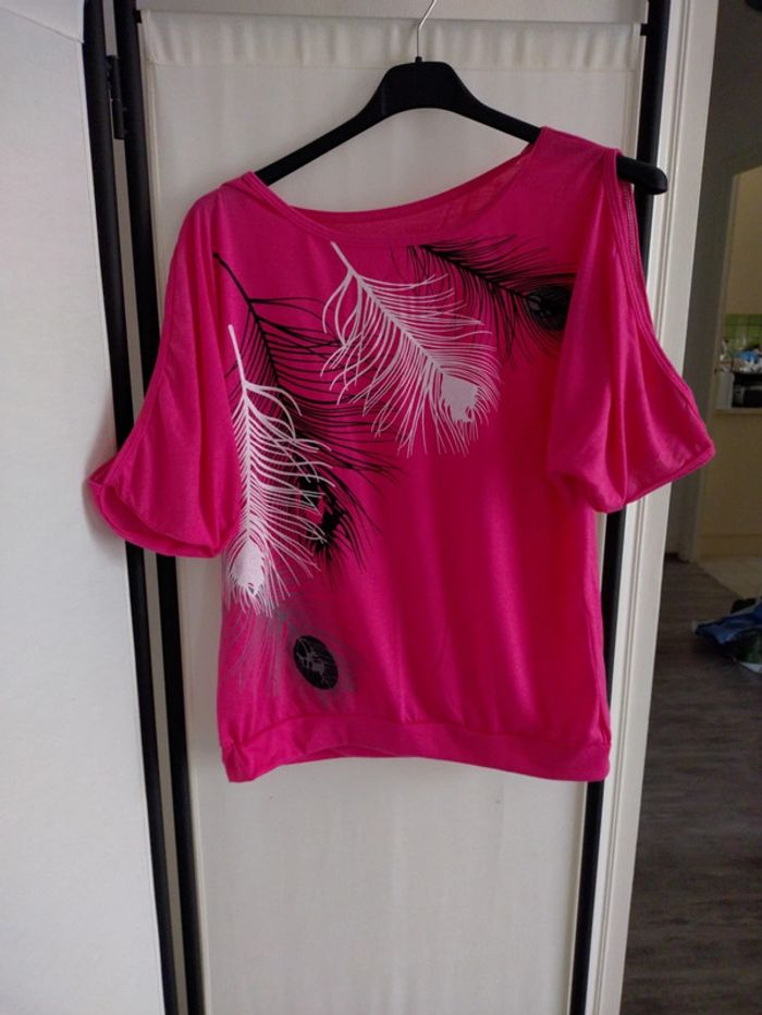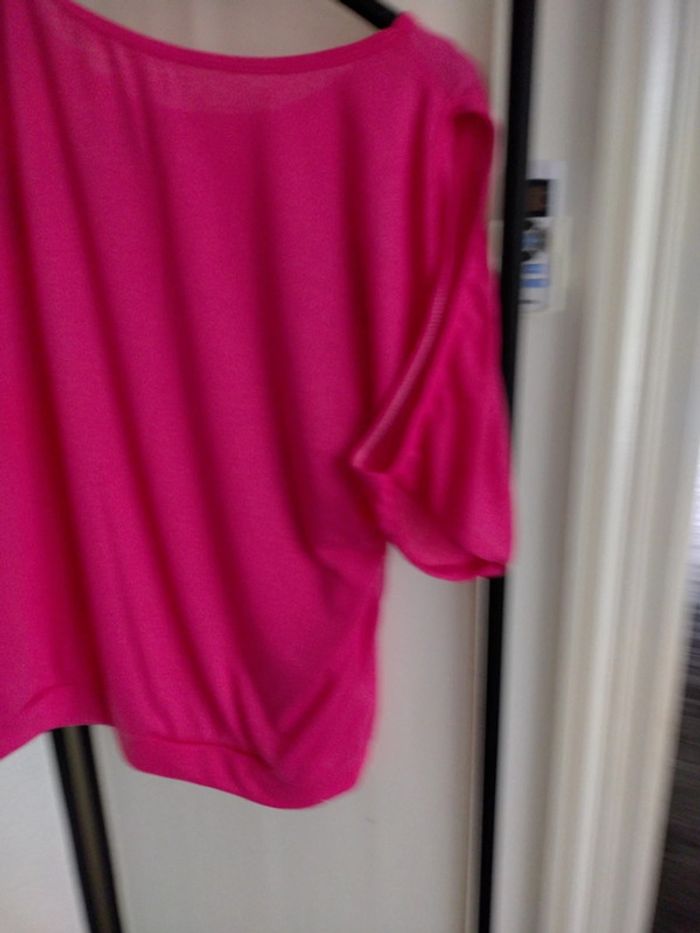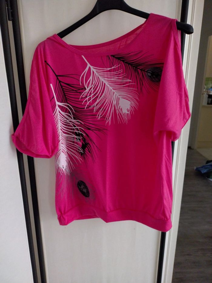 Tee shirt rose fushia, épaules dénudées, manches courtes, taille légèrement blouson. État impeccable, jamais porté