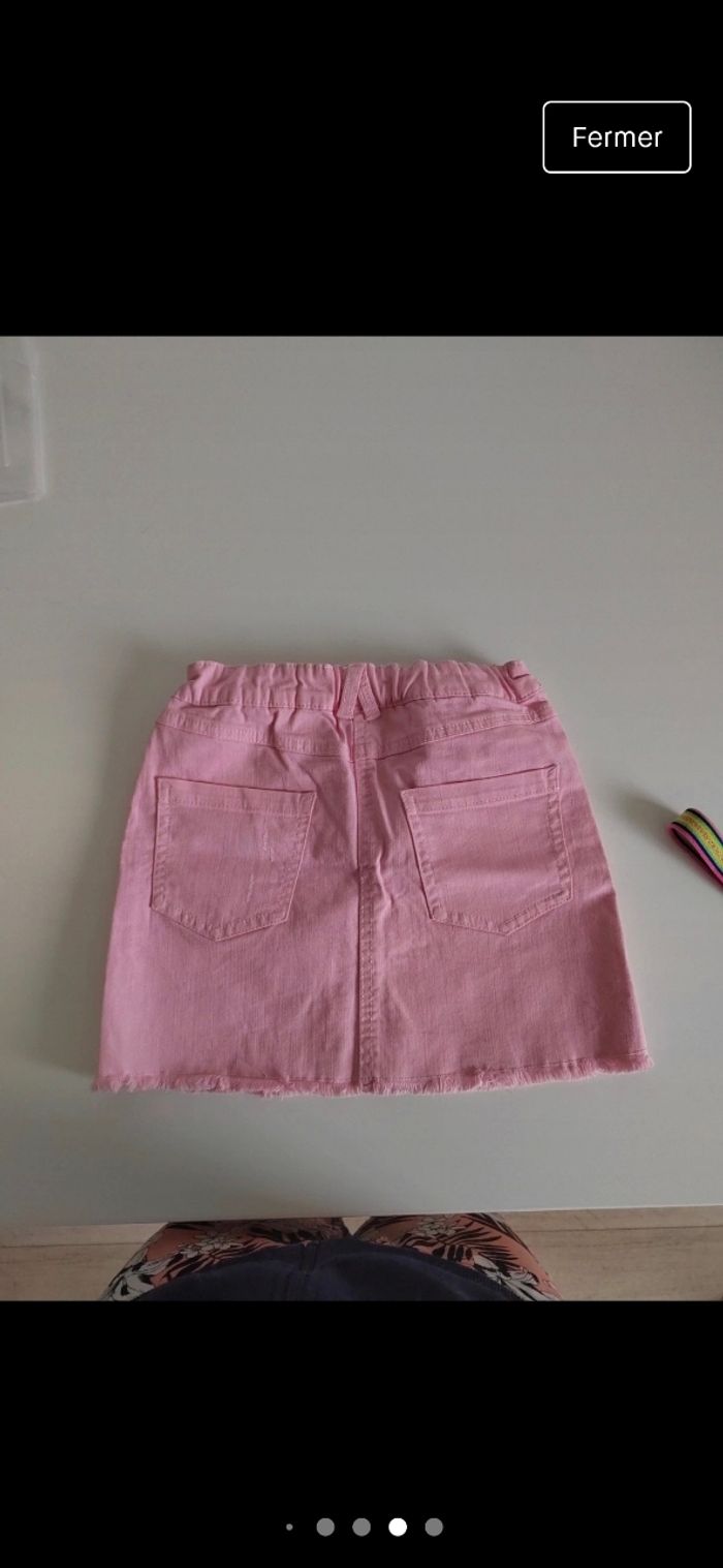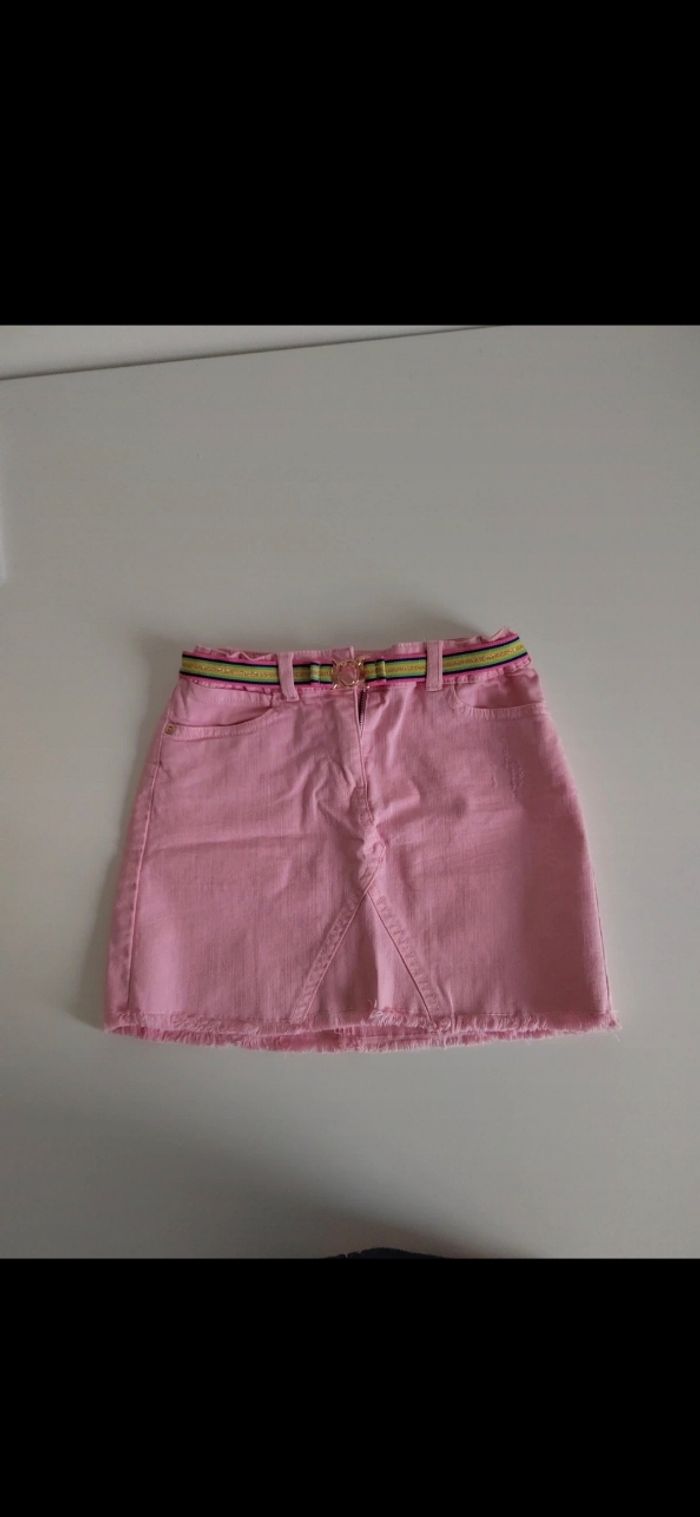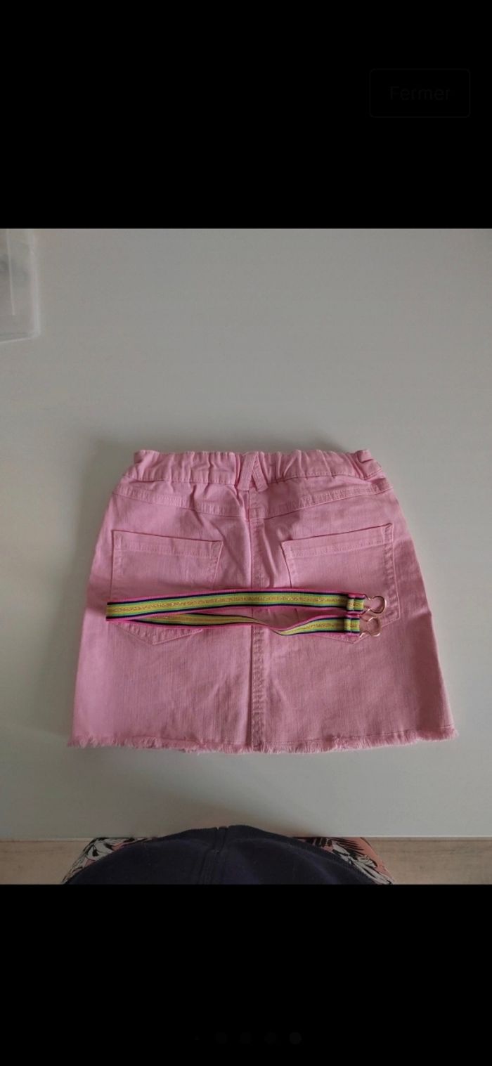 Jupe fille rose façon jeans avec ceinture. Rebords de la jupe en bas effilés poche et bouton pression devant. Taille ajustables par des élastiques à l'intérieur Taille 10 ans