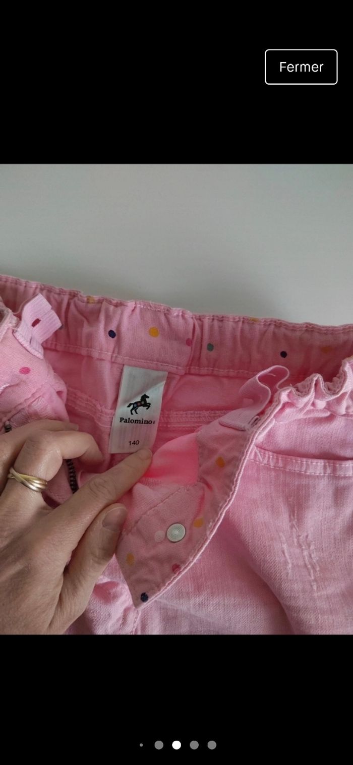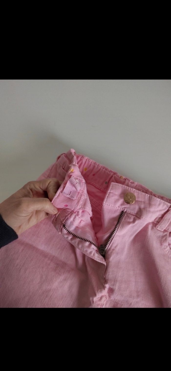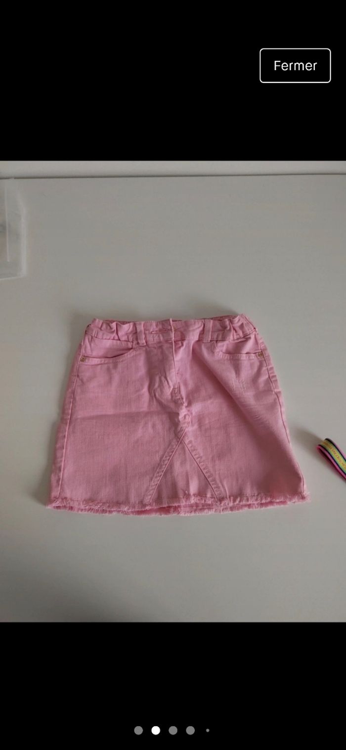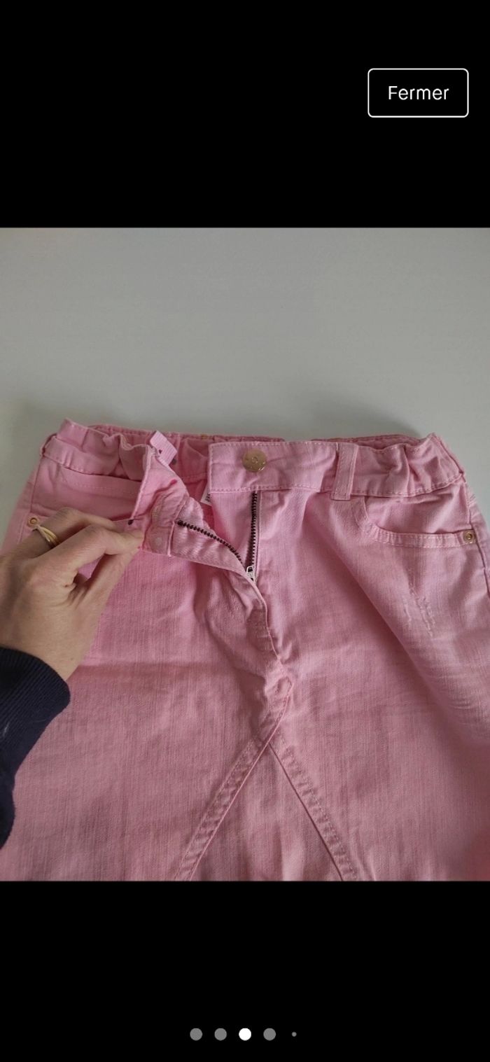 Jupe fille rose façon jeans avec ceinture. Rebords de la jupe en bas effilés poche et bouton pression devant. Taille ajustables par des élastiques à l'intérieur Taille 10 ans