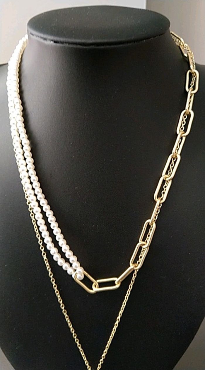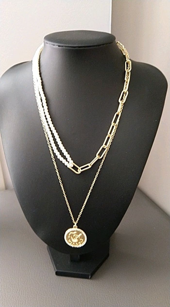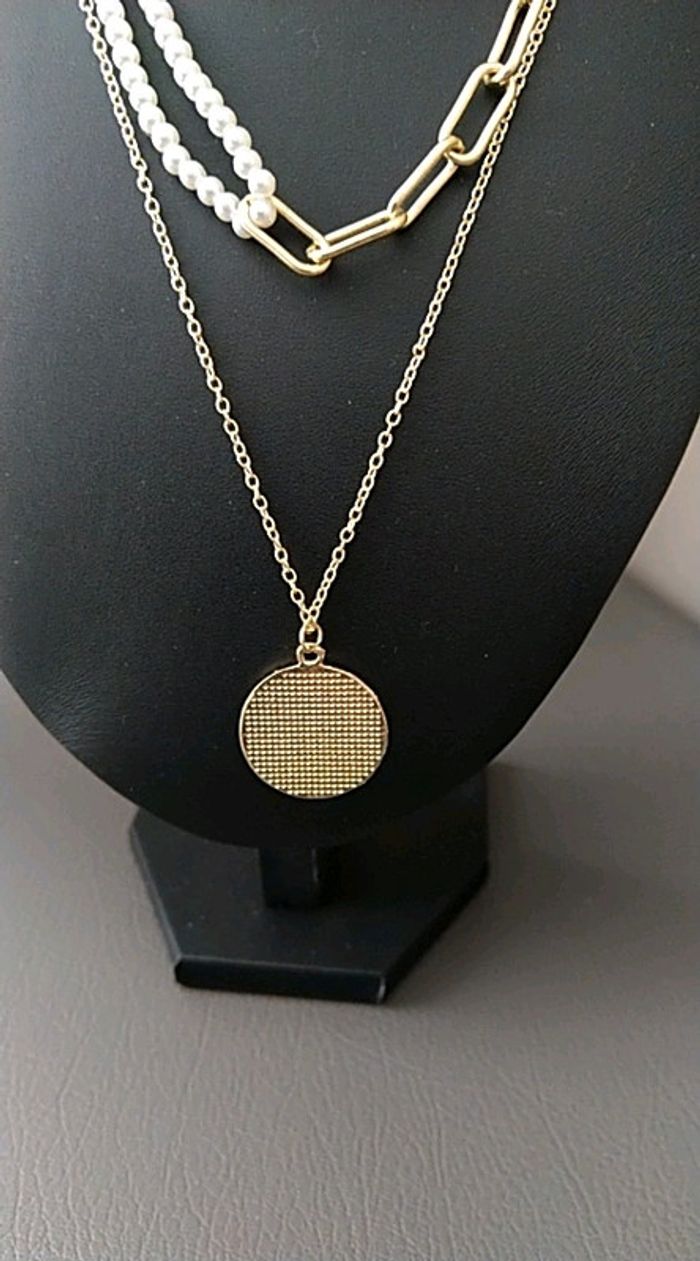 Collier double avec perles, grosses mailles et médaillon, rallonge 4cm. Fantaisie. Neuf