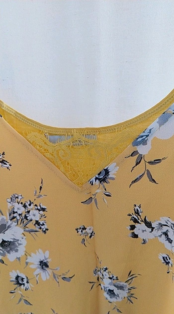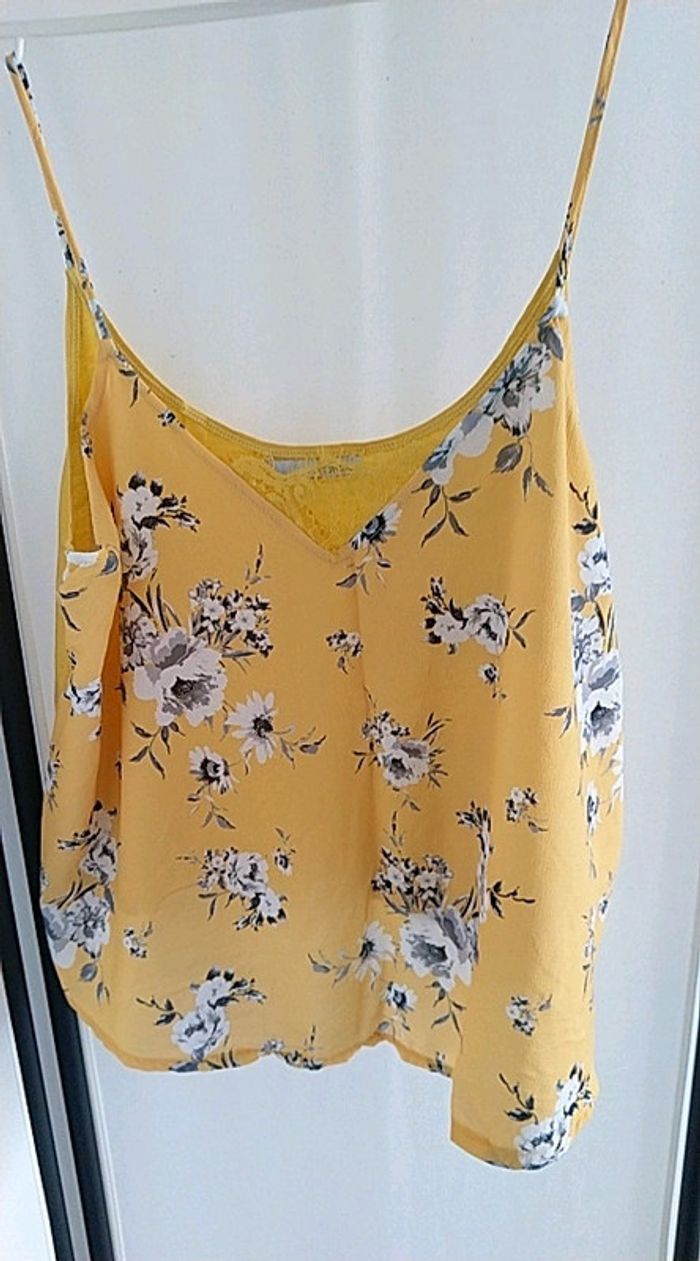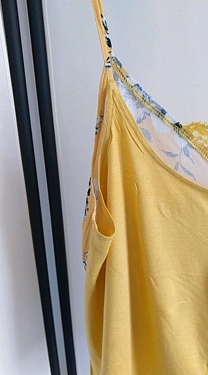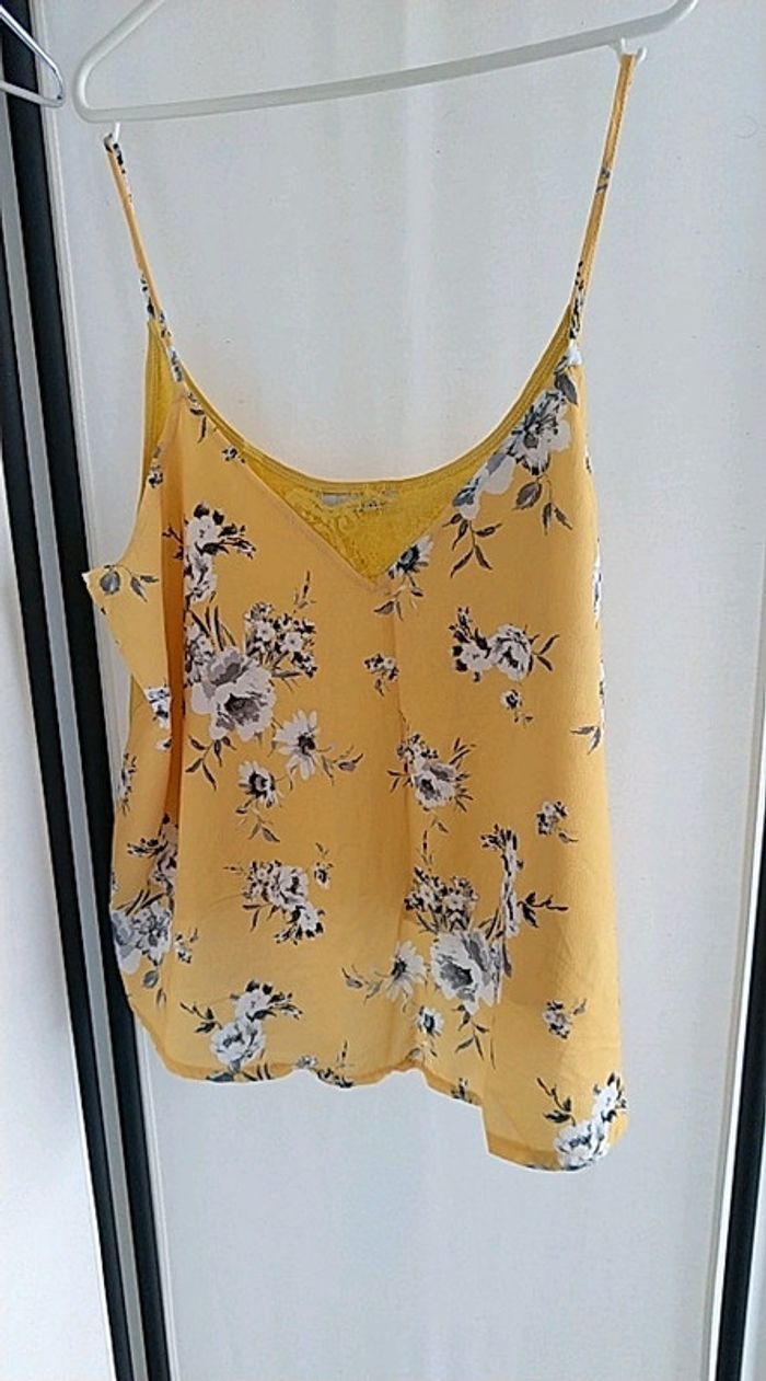 Débardeur jaune. Jaune uni derrière. Polyester viscose. Forme évasée. État impeccable.