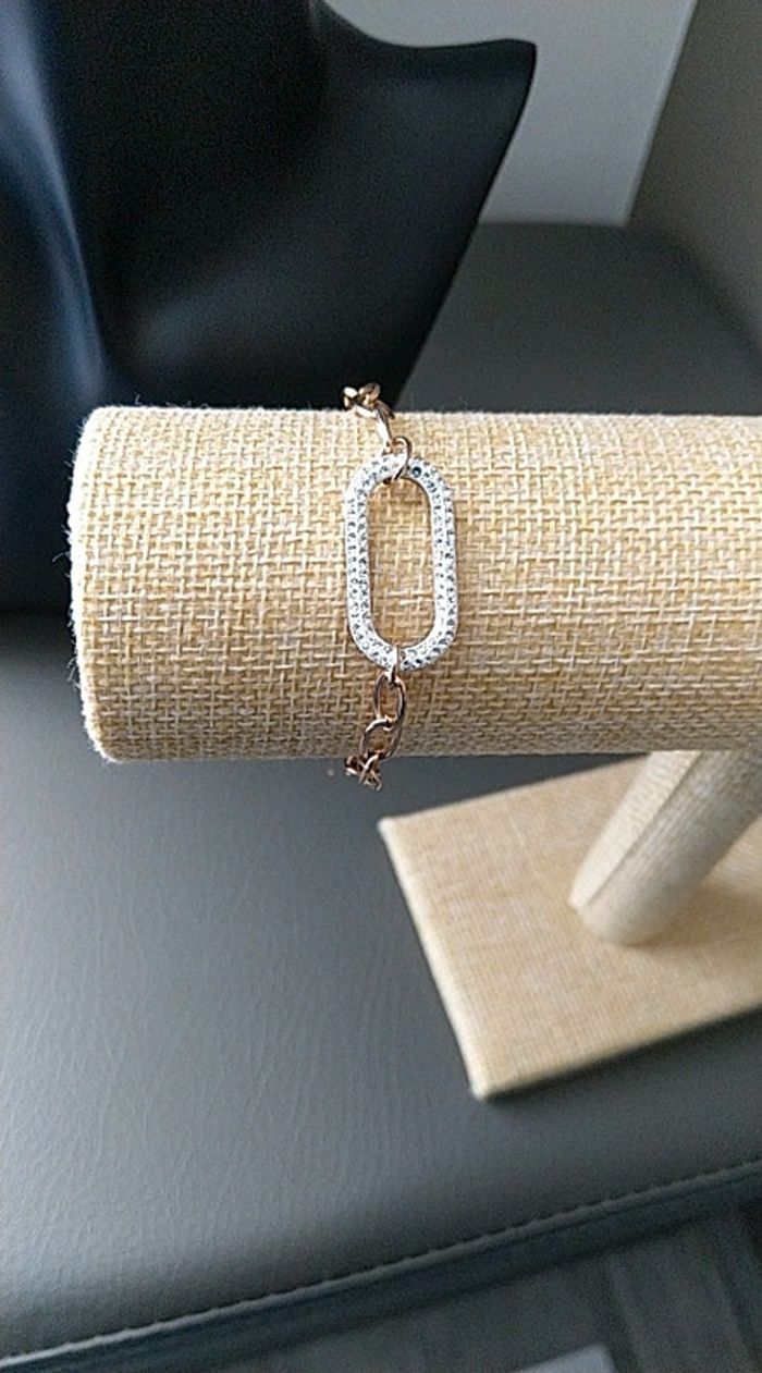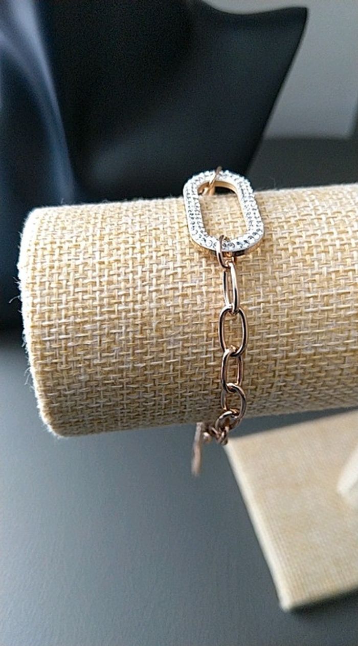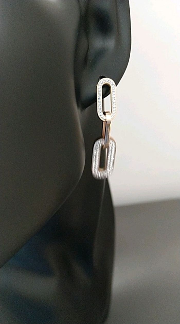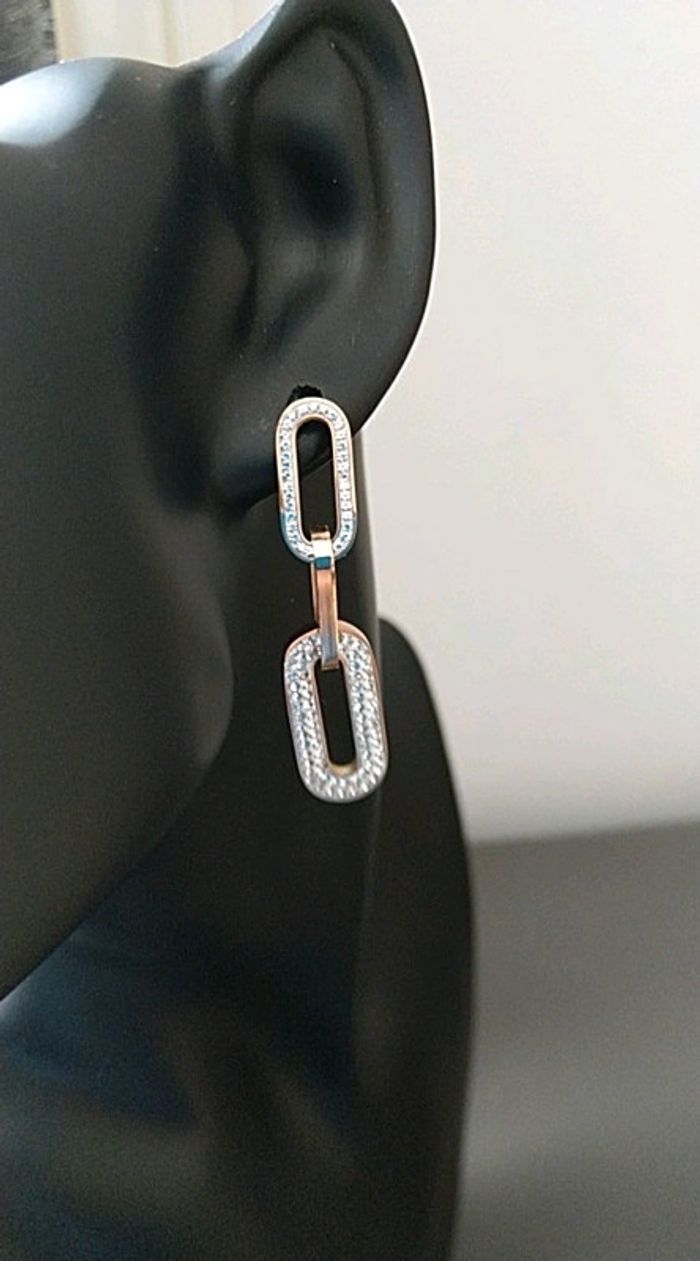 Superbes boucles d oreilles strass et acier inoxydable. J'ai la gourmette assortie 16 cm+ 5. Acier inoxydable rose gold. Le tout est neuf dans pochon organza, la gourmette à 10 euros