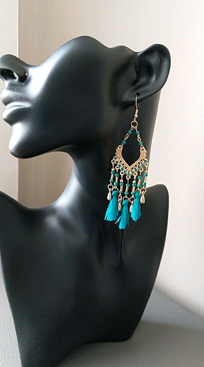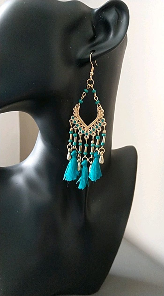 Boucles d'oreilles percées bohème et pompons dorées avec petites perles bleu vert. Jamais portées