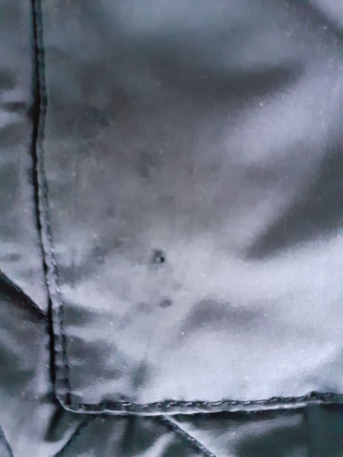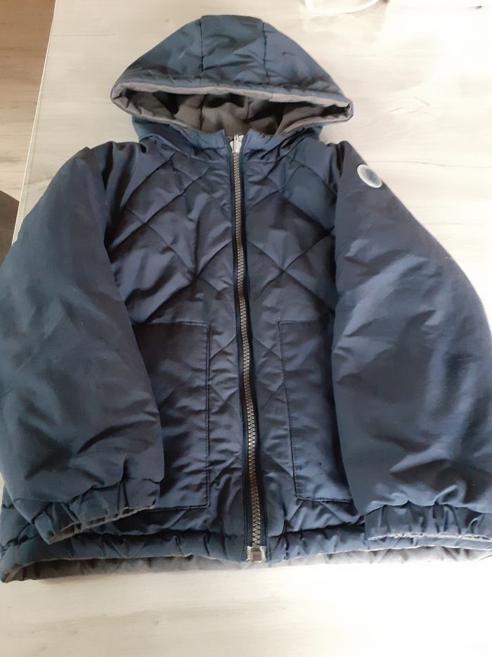Vends manteau à capuche réversible un côté marine et 1 côté gris 2 petits accrocs qui se voient peu (voir photos) peut encore bien dépanner