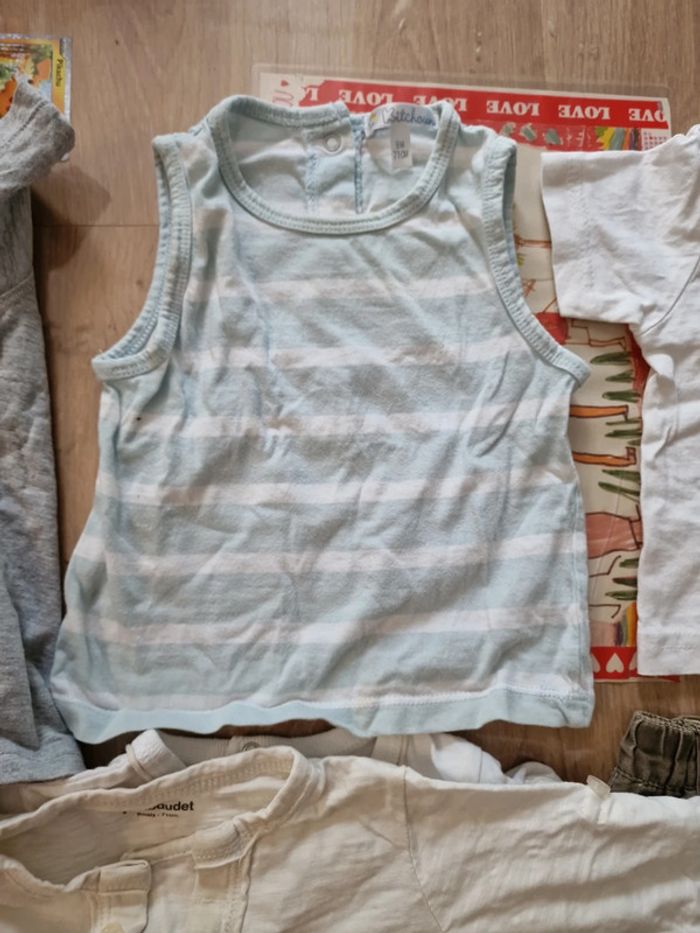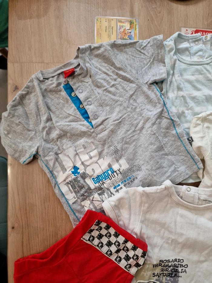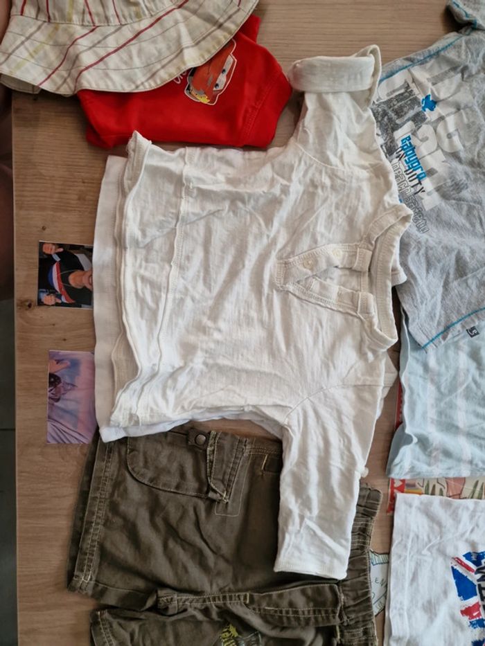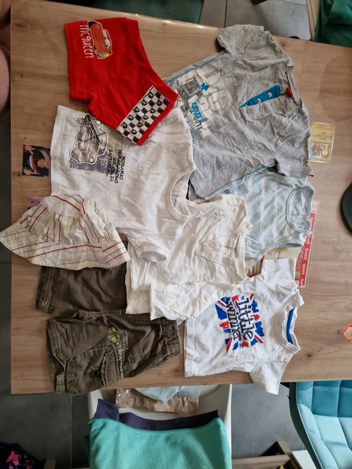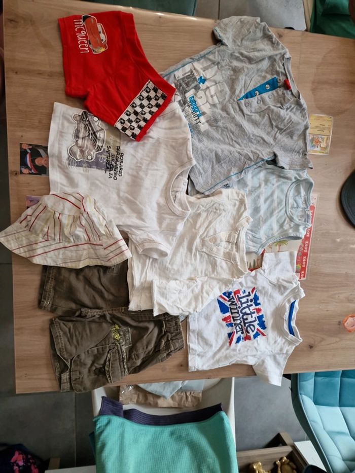 Lot de 7 pièces comprenant - 1 bermuda 12 mois #kidkanai -1 tee-shirt blanc little winner 9/12 mois #littlerebel - 2 tee-shirt 9 mois #vertbaudet - 1 tee-shirt gris #babygro - 1 débardeur 9 mois #kitchoun - 1 maillot 12 mois #carsdisney #cars #disney