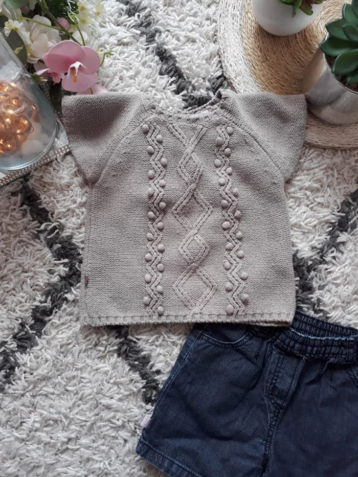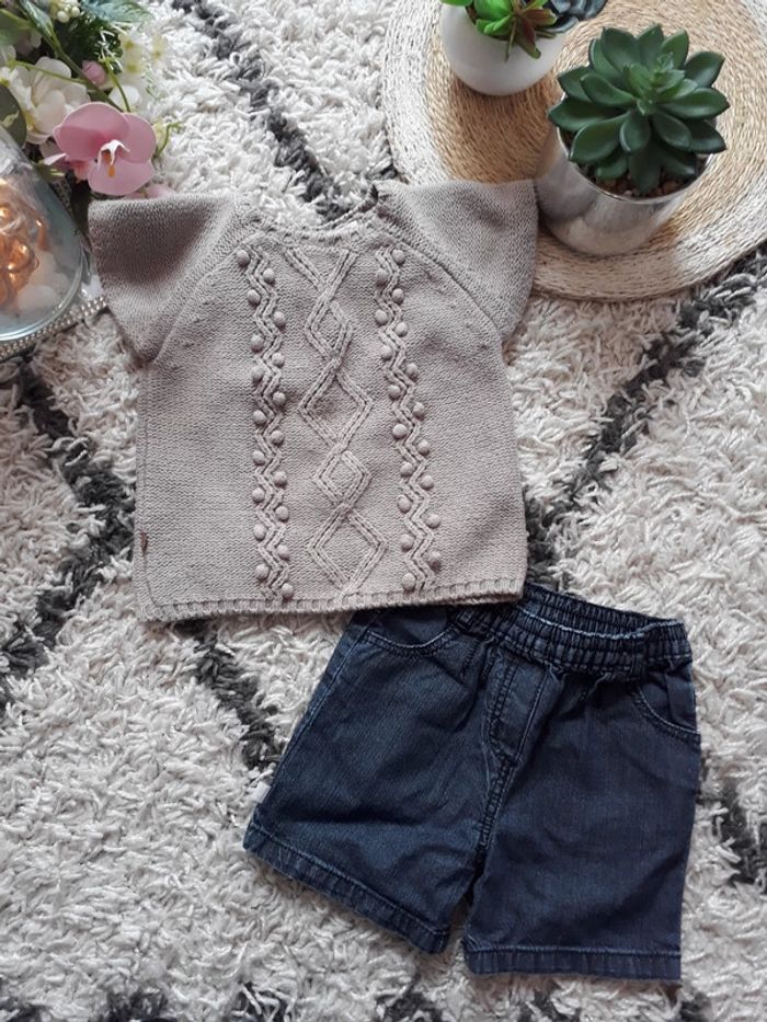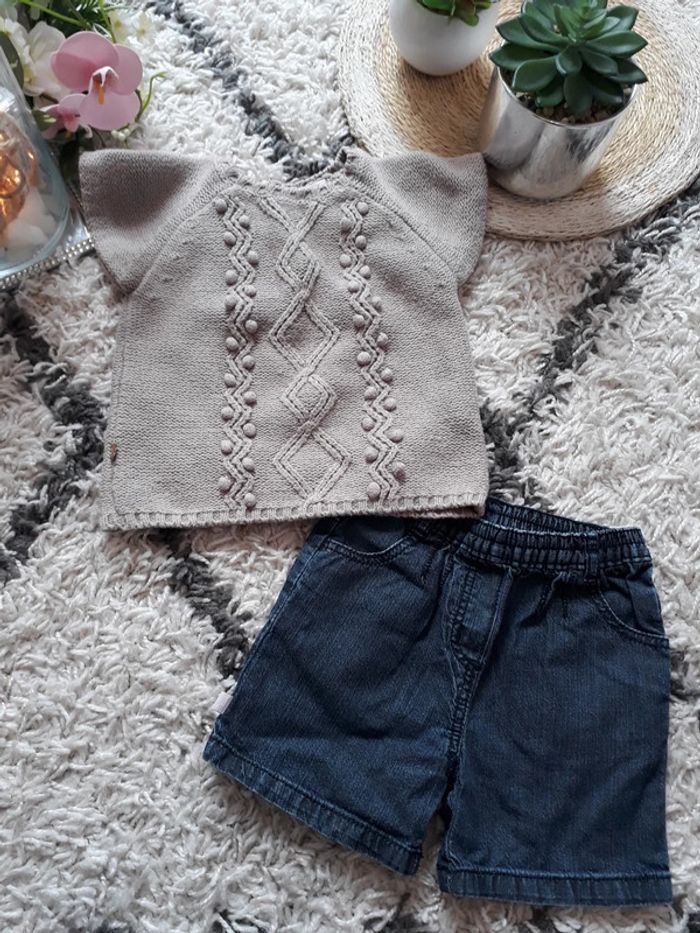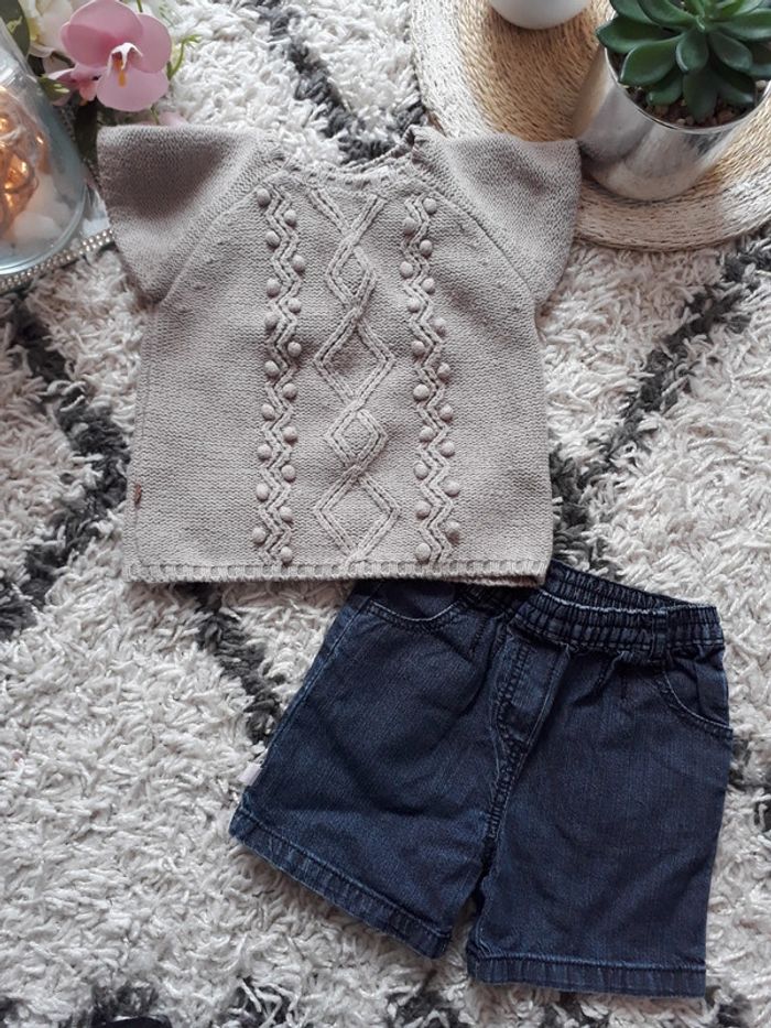 Vends ensemble assorti haut en laine tape à l'œil et bas short en jeans Okaïdi, porté quelques fois, en très bon état #mayevêtemntfille6mois