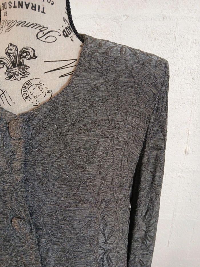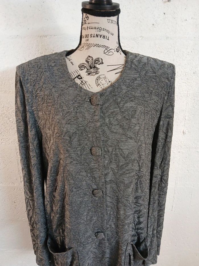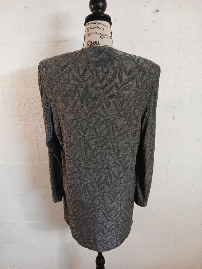 Veste grise imprimée ton sur ton Marque S and G Matière très fluide et fine Épaulettes Pas d etiquette de taille mais convient pour une taille 42/ petit 44 Largeur aisselles 53 cm Longueur dos 85cm Bon état sauf les poches qui se sont un peu détendues, voir photos 🌈 Pensez au lot afin de limiter les frais de port mais aussi pour faire des économies car les réductions sont actives dès 2 articles 😍 🌈