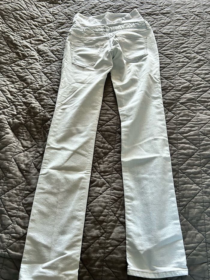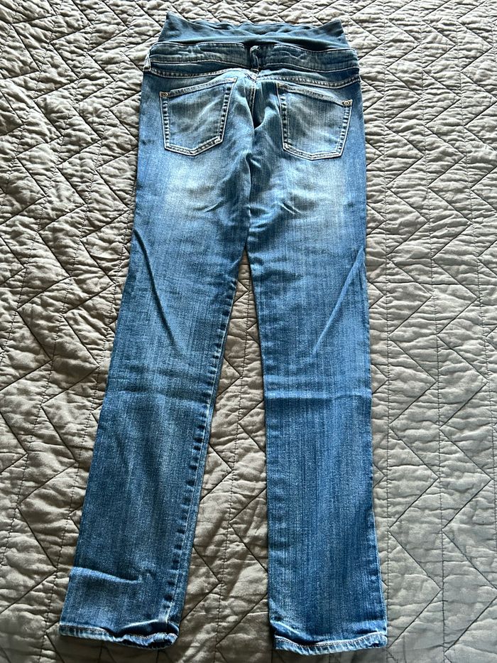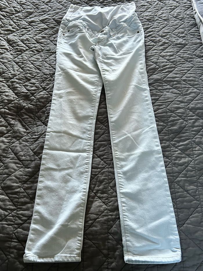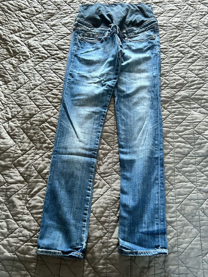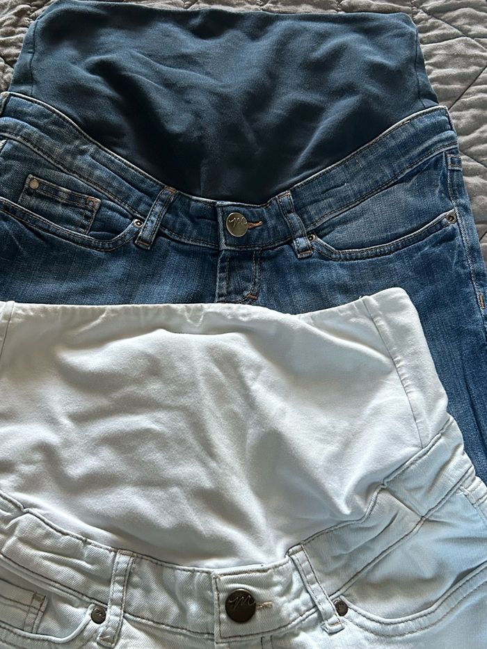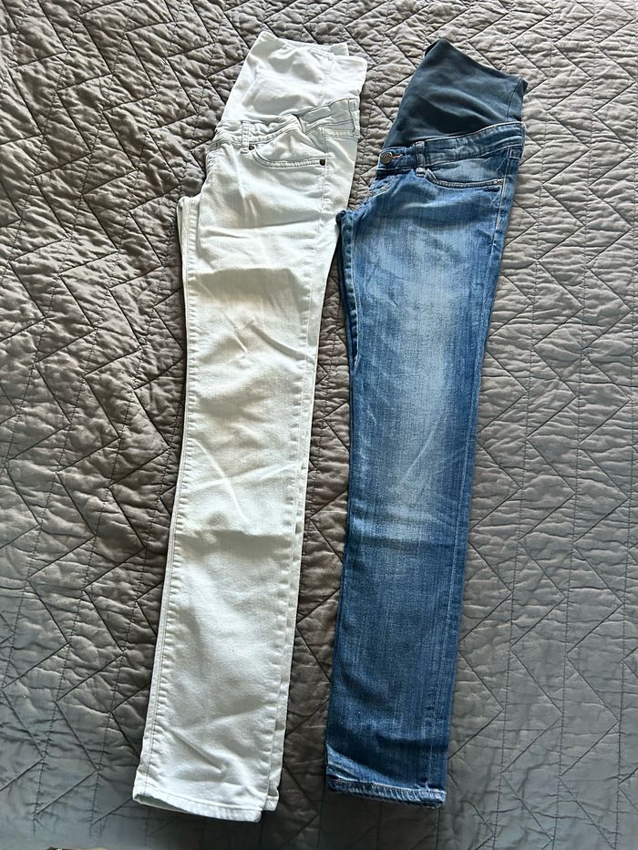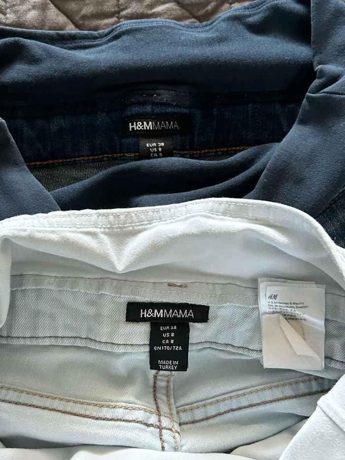 Lot de 2 jeans de grossesse, taille 38 de la marque « H&MMAMA ». 1 bleu jeans et 1 bleu très clair. Empiècement pour le ventre en tissu souple qui s’adapte à la grosseur du ventre. Forme droite et étroite. En excellent état.
