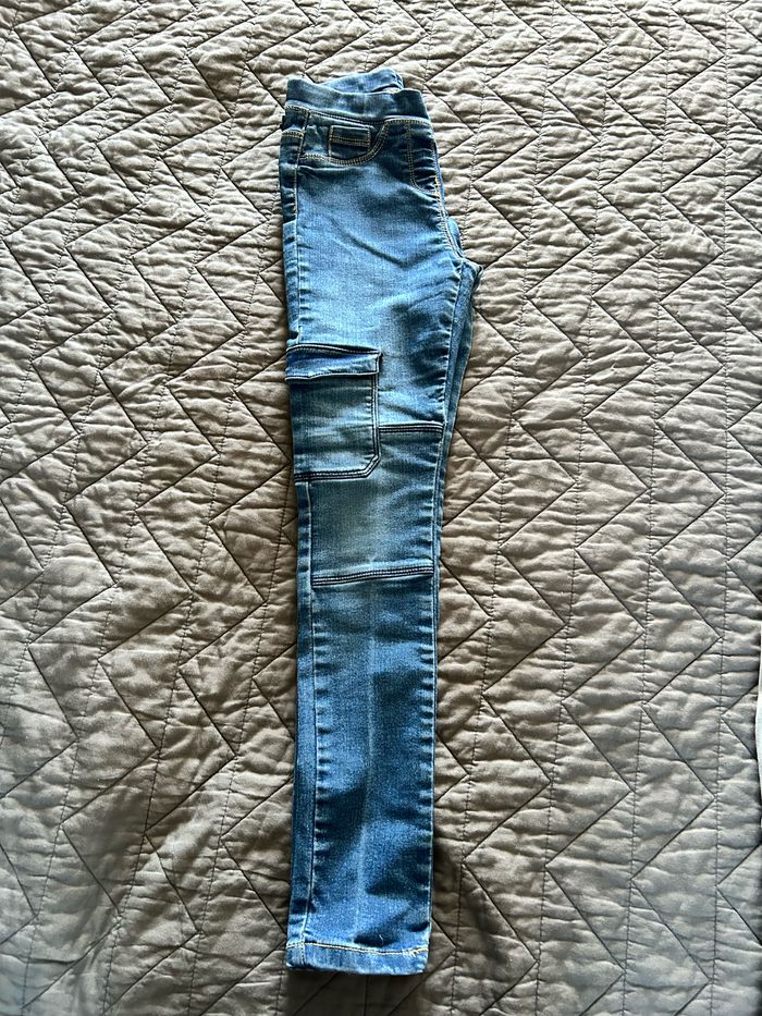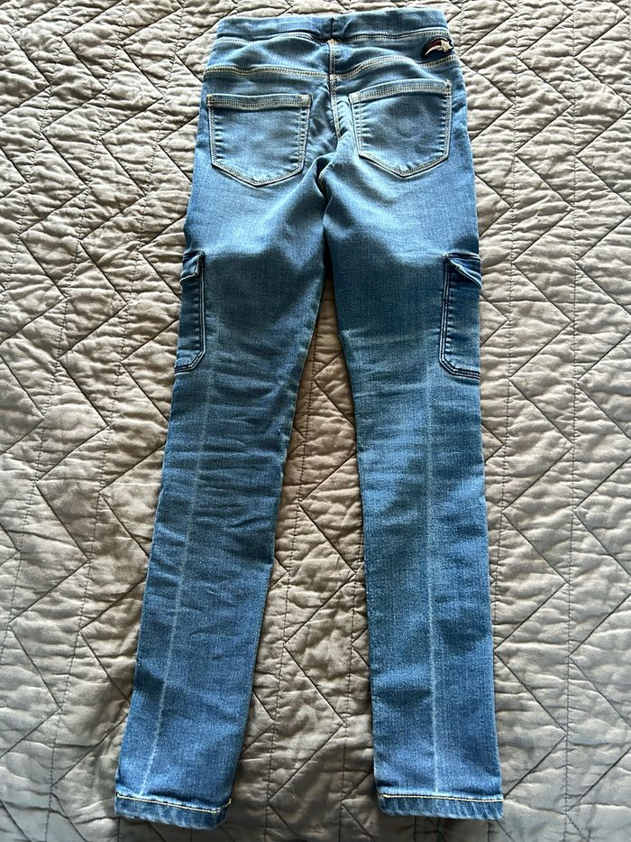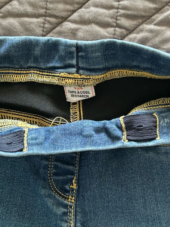 Jeans taille 10 ans de la marque « Tape à l’œil ». Forme jegging skinny (qui s’enfile) avec 2 grandes poches sur chaque côté au dessus du genou, donnant un effet baggy. La taille est élastique avec des boutons pour ajuster au mieux. Porté mais encore en très bon état.