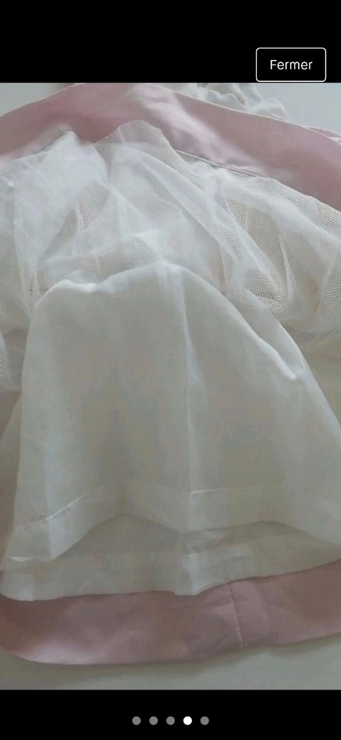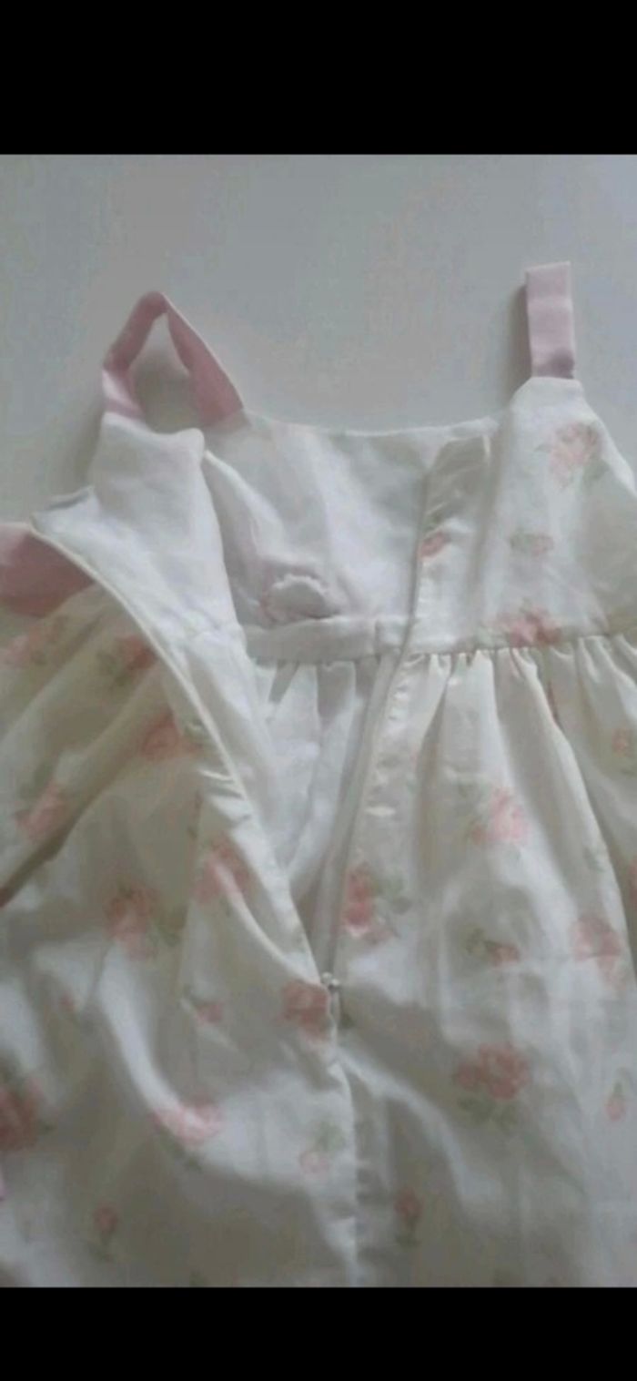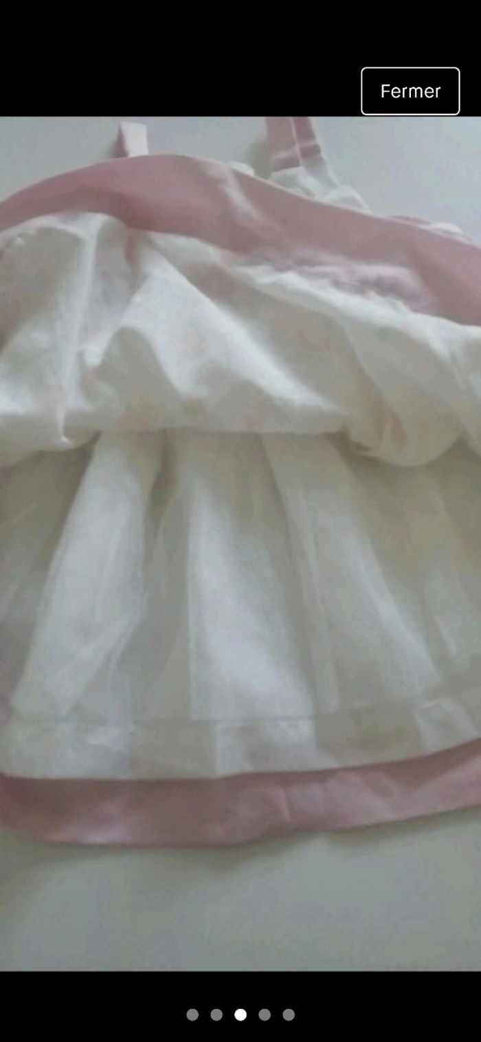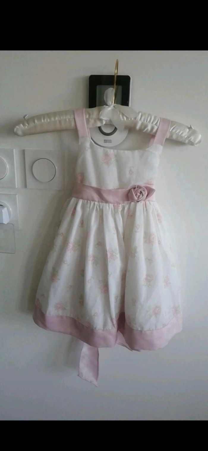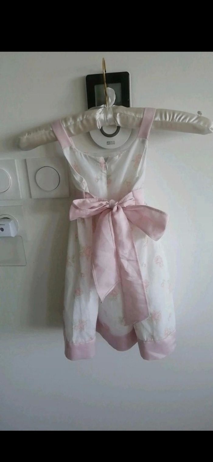 Robe d'été motif rose avec petite ceinture ruban. Doublure tissu et tutu. Fermeture éclair derrière pour faciliter l'enfilage. Taille 81 cm