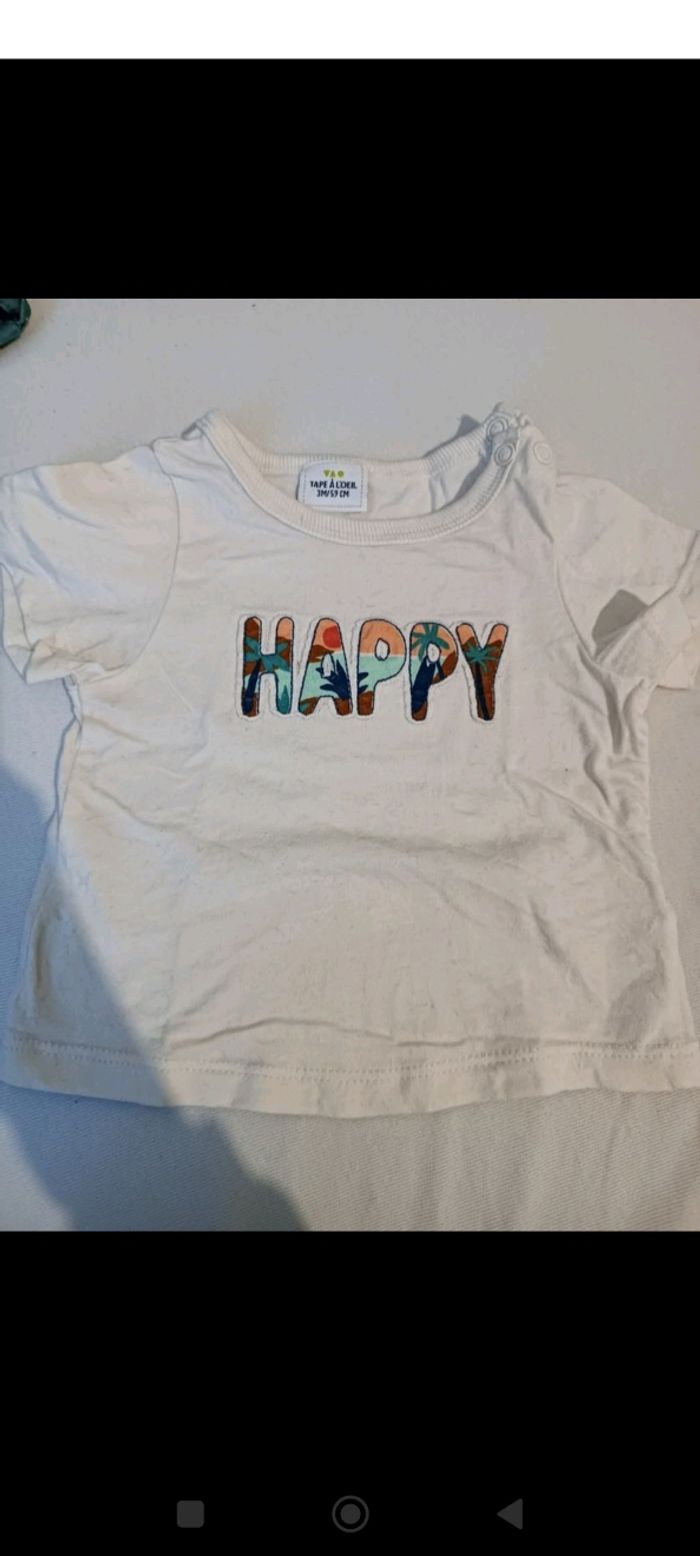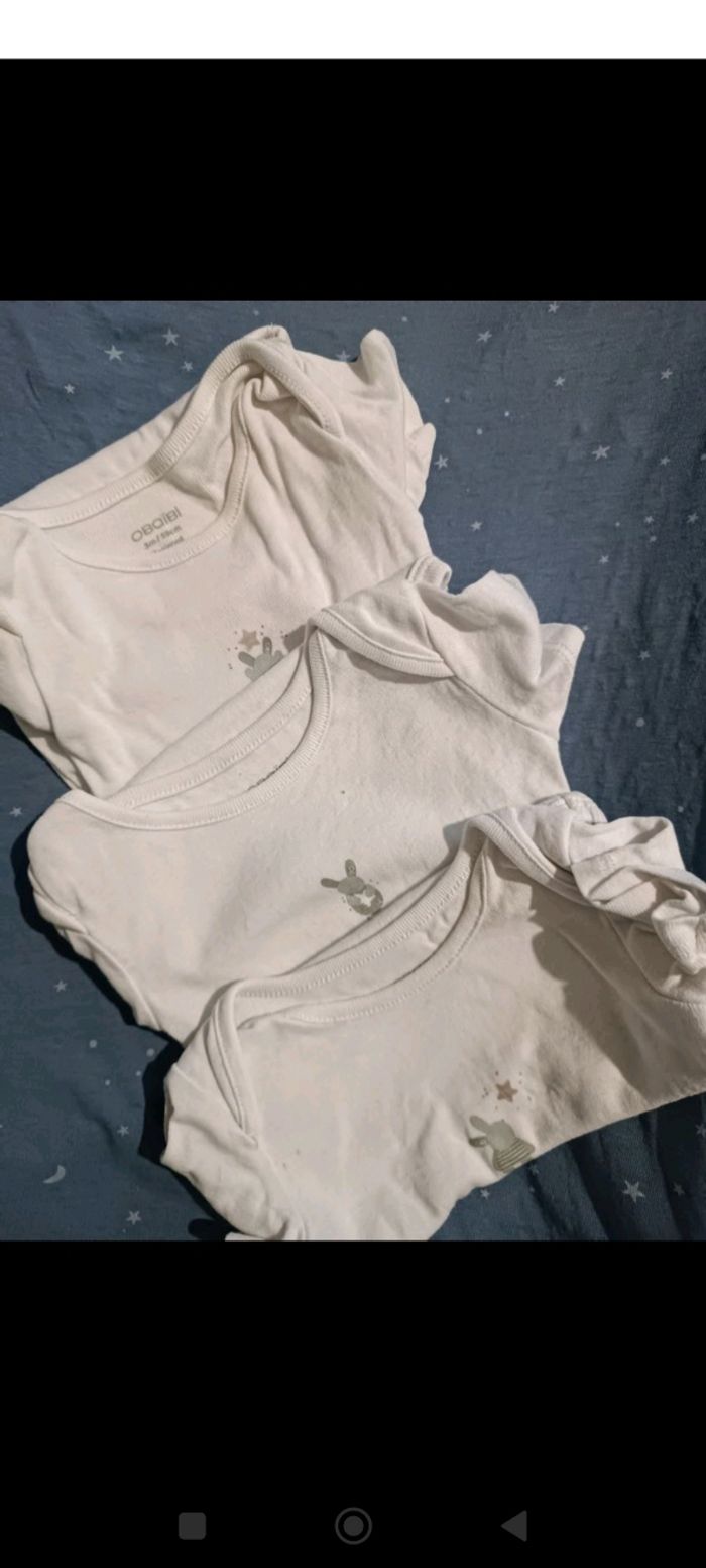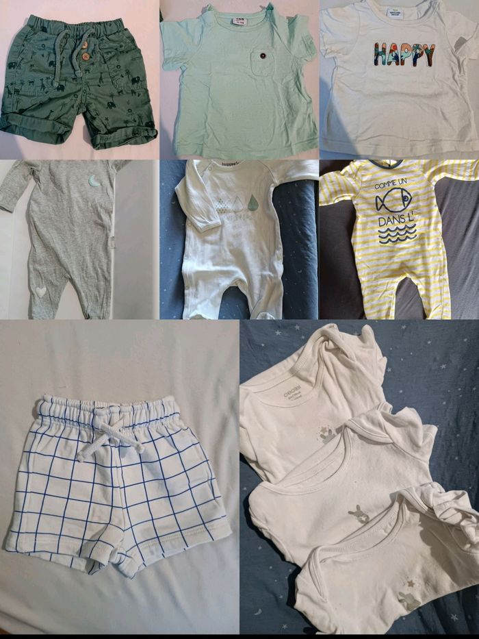 3 pyjamas fins 3 bodys courtes manches 2 t shirts courtes manches 2 pantalons Le tout en très bon état Marques : TAO, Bemini, Obaibi