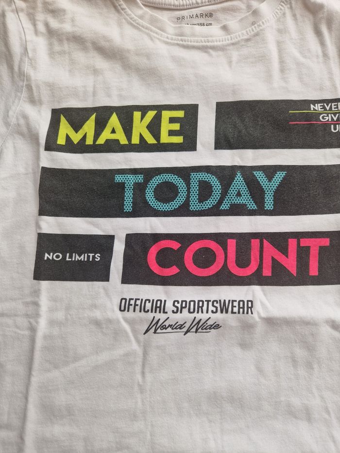 T-shirt à manches courtes pour garçon Taille 12 / 13 ans Acheté à Primark Coloris blanc avec inscription fluo Très bon état Pas de tâche ni de trou 100% coton