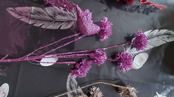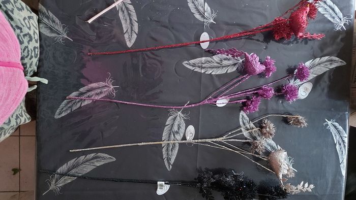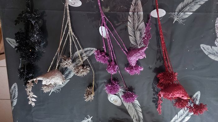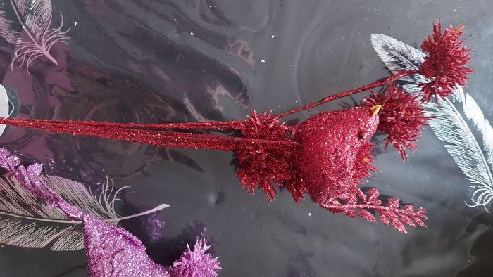 Tiges avec oiseaux et végétation, pailletés. Plusieurs couleurs disponibles et plusieurs tiges disponibles dans chaque coloris Longueur totale environ 70 cm Gifts Prix à la pièce, prix réduit pour achat en lot