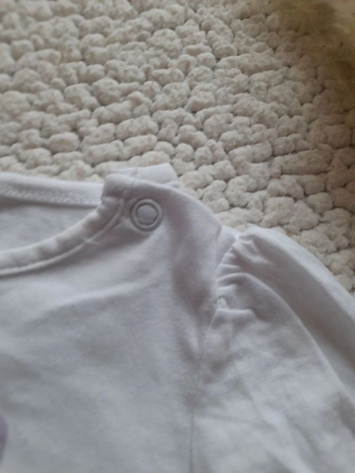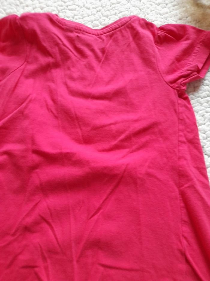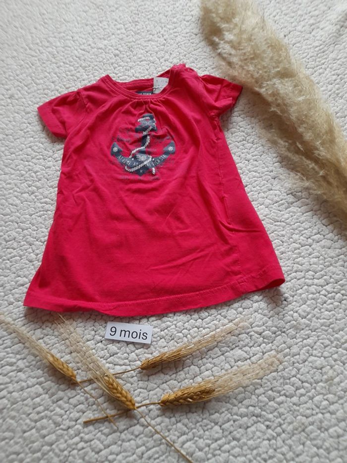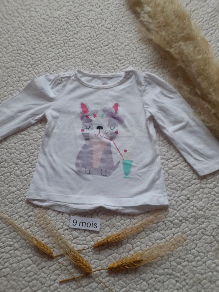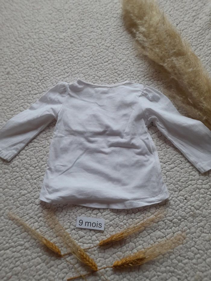 le blanc est un t-shirt longues manches de chez C&A très peu porté, sans trou ni taches le t-shirt rose est en très bon état sans trou ni taches et c'est du 9-12 mois