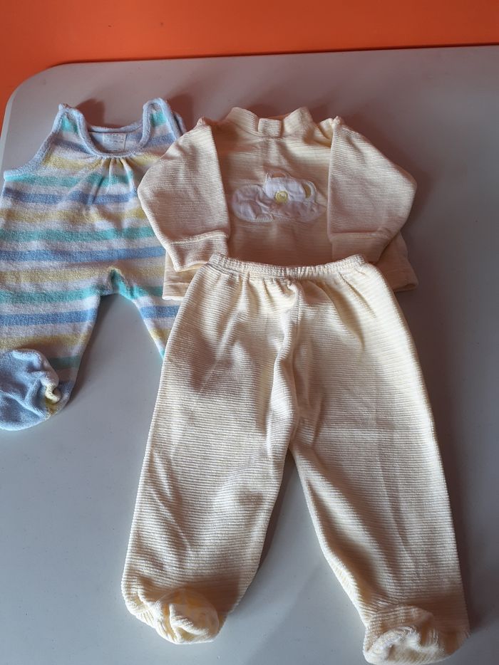 Vends pyjama ou ensemble 2 pièces rayé jaune et blanc pratiquement neuf et gigoteuse rayé sans manches avec pieds