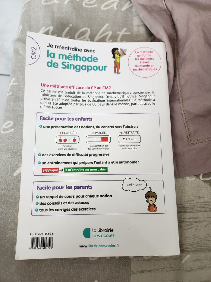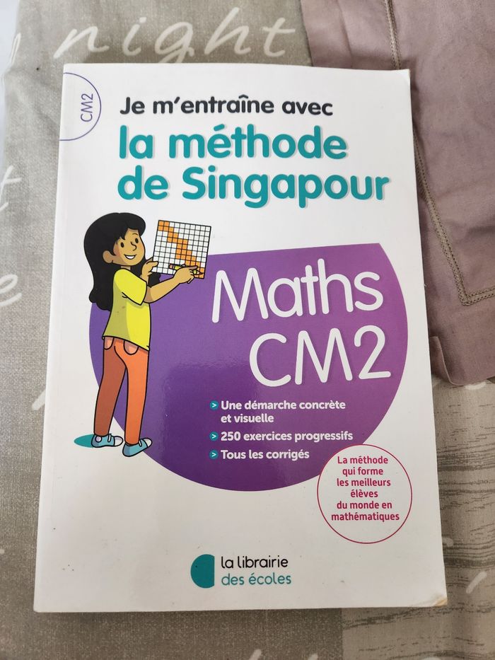 Livre : Je m'entraîne avec la méthode de Singapour. Math CM2. Livre en bon état dans l'ensemble, les premières pages sont déja faite ( voir photo n°3 ). Mais cependant très bon livre pour apprendre les mathématiques. Livre acheté à 14,50 €