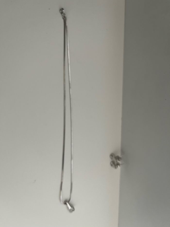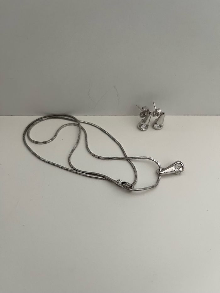 Parure bijoux avec pierre transparente La parure est composé - Boucles d’oreilles - Collier avec pendentif Longueur chaîne 19 cm environ Jamais porté